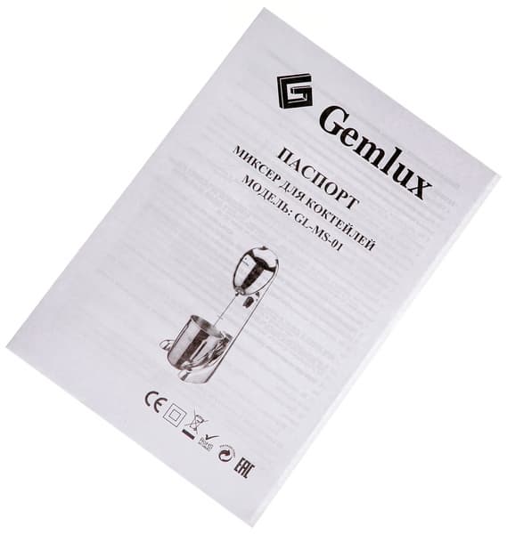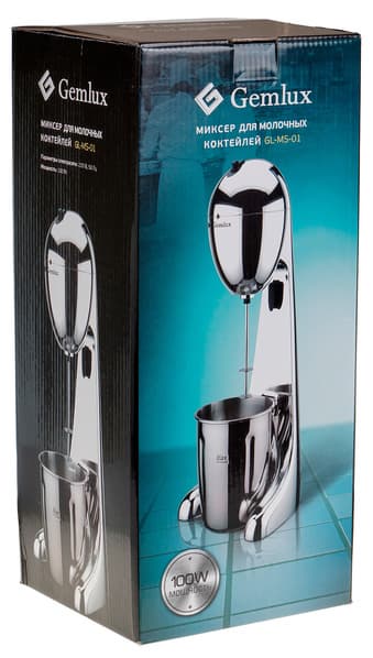 Коробка характерного для Gemlux сочетания бирюзового и черного цветов со всех сторон украшена изображением миксера для молочного коктейля в полном сборе. И то правда: такую красоту надо нести в массы. А больше почти никаких сведений о приборе на коробке нет: мощность 100 Вт, наличие функции «Пульс» и комплектность — шпиндель, стакан, хромированный корпус.