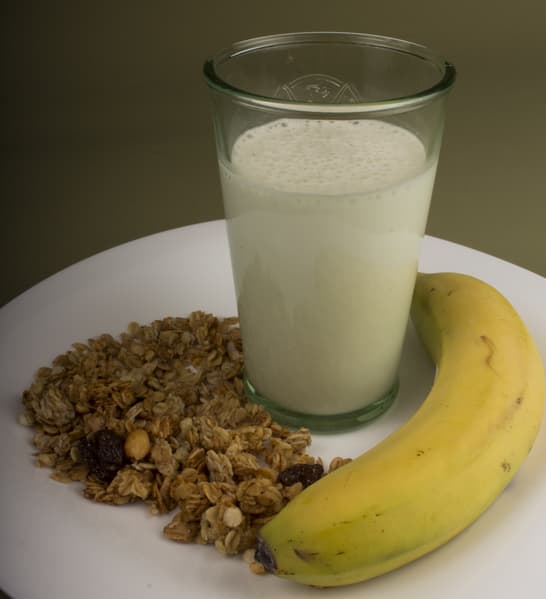 Мы взяли готовые мюсли, положили их в стакан, залили молоком прямо из холодильника и оставили минут на пятнадцать: как раз хватит времени почистить зубы и принять душ. Затем очистили банан, растолкли его в пюре (две минуты это заняло, не больше), закинули в стакан и включили взбивание.
