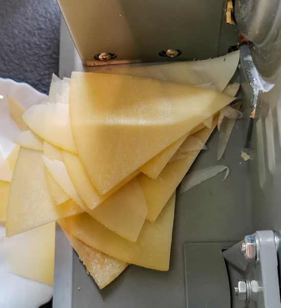 С нарезкой белорусского «пармезана» никаких проблем не возникло, куски получаются тонкие и ровные. С полутвердым сыром нужно повозиться чуть больше: край периодически задирается и сам сыр липнет к диску.