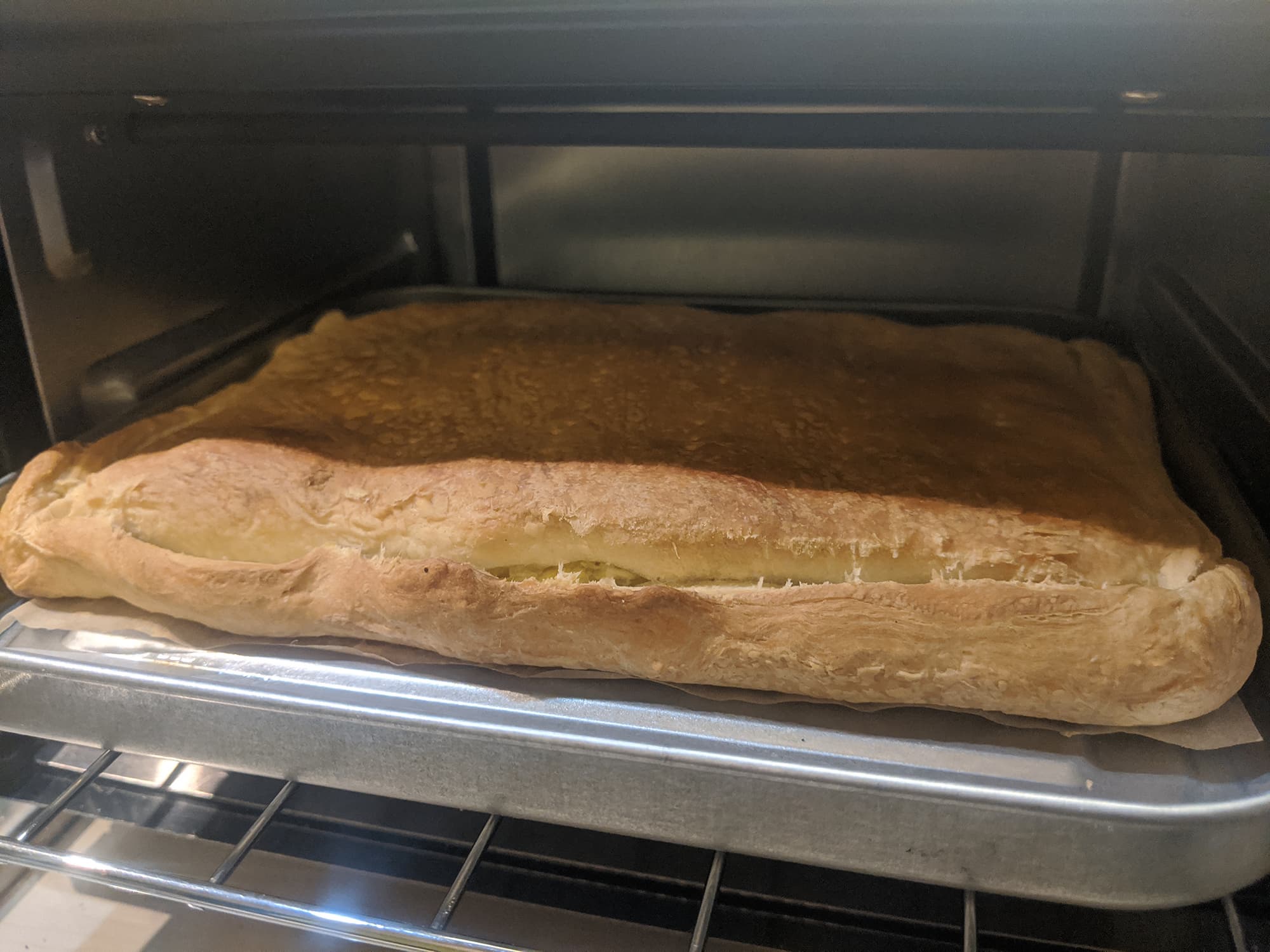 Слоеное дрожжевое тесто пропеклось отлично, а поверхность пирога подрумянилась равномерно по всей площади.