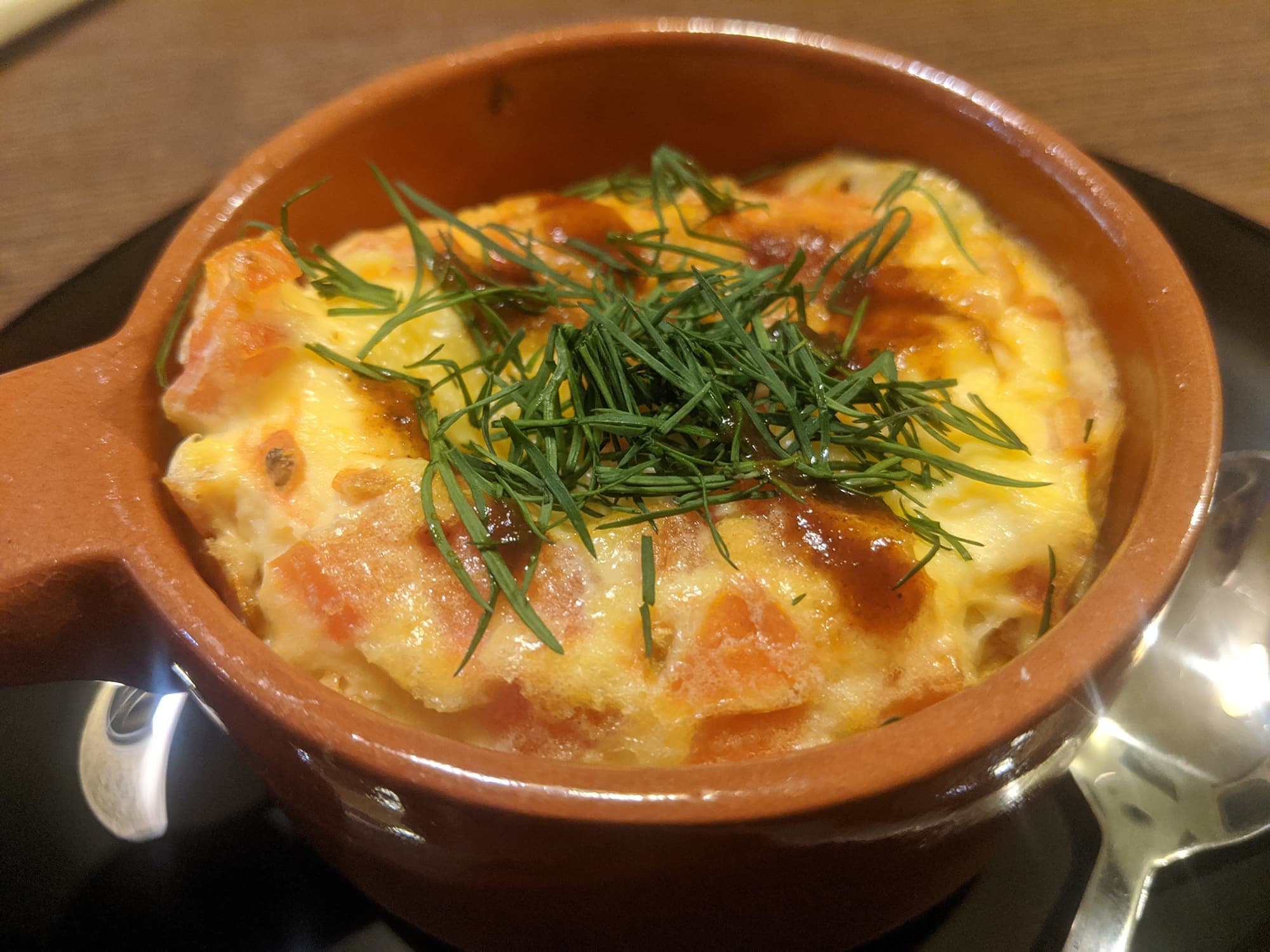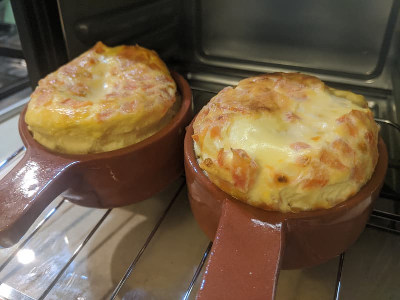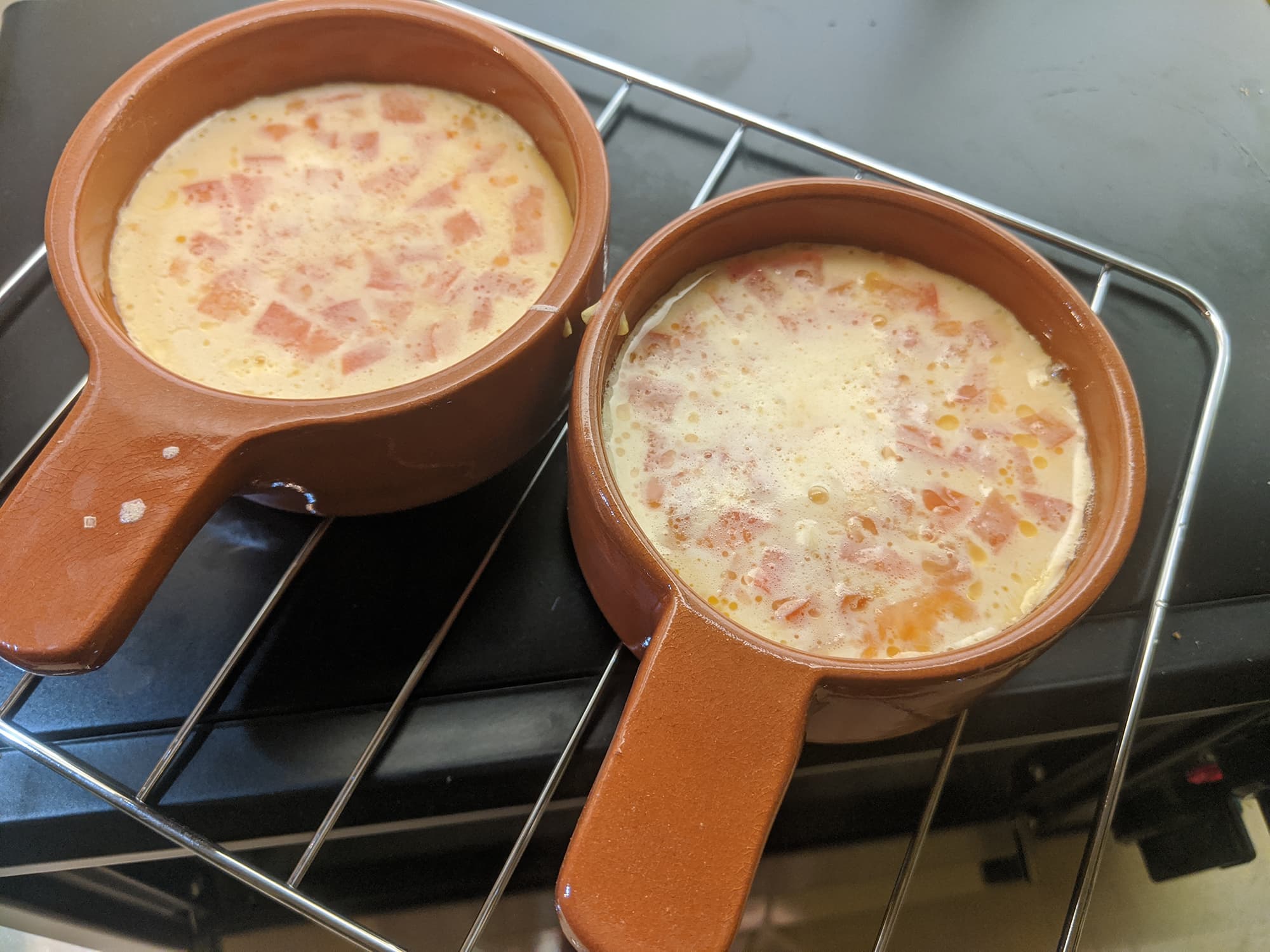 Мы включили духовой шкаф на 210 градусов и поместили в него керамические кокотницы, смазанные маслом. Пока духовка и формы разогревались, взбили яйца с небольшим количеством молока (по одному яйцу на порцию) и добавили во взбитую массу мелко нарезанные помидоры и сыр.