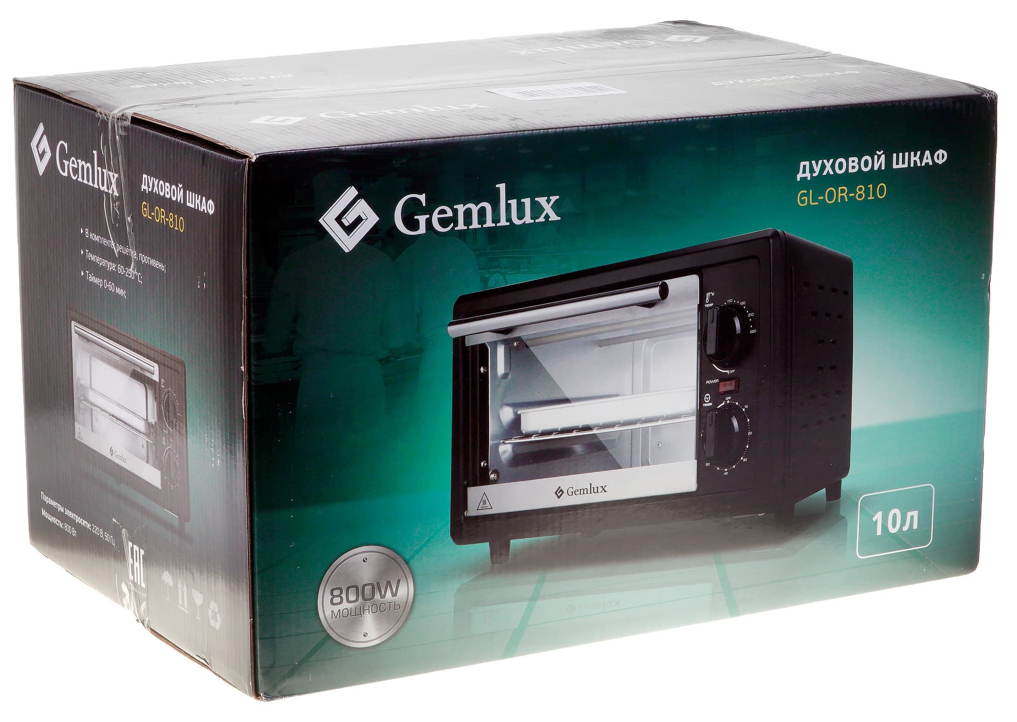 Коробка, как обычно у компании Gemlux, из глянцевого картона в бирюзовых и черных цветах. Фоном идет размытое изображение поваров, которые заняты приготовлением пищи. На широких сторонах изображена духовка во всех подробностях, вид три четверти. Там же есть медальон, в котором указана мощность, и картуш с объемом — 10 литров. Названия компании, модели и типа прибора — там же.