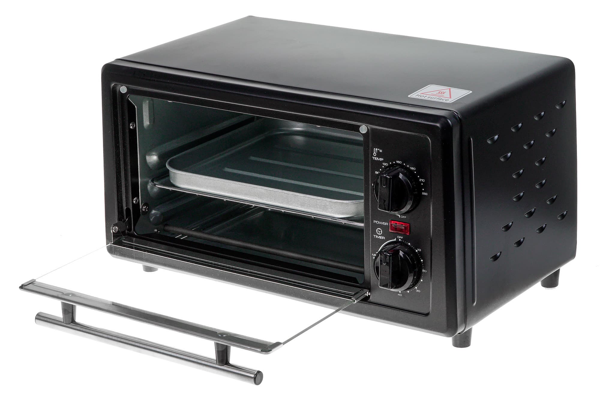 Мини-печь включается с помощью двух механических переключателей: температуры и времени. Сначала надо установить нужную температуру, а затем выставлением таймера включить устройство.