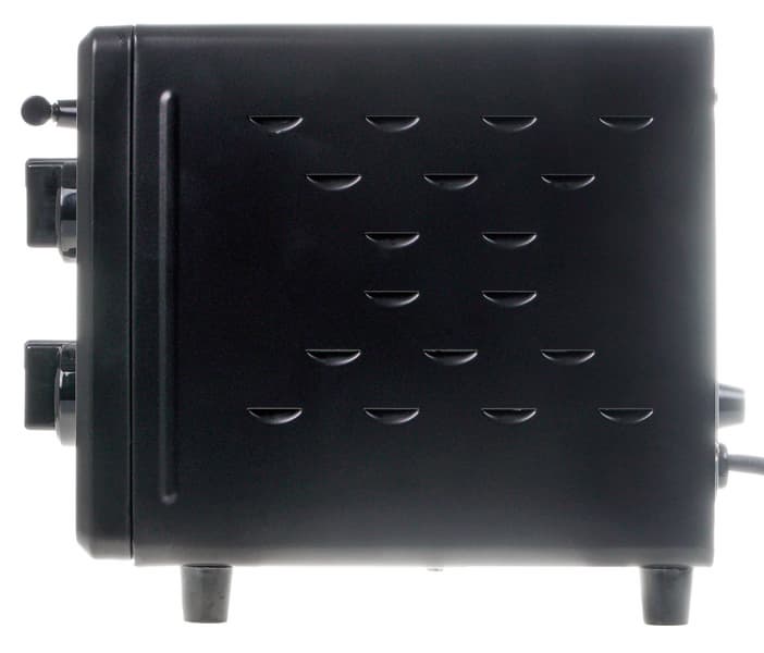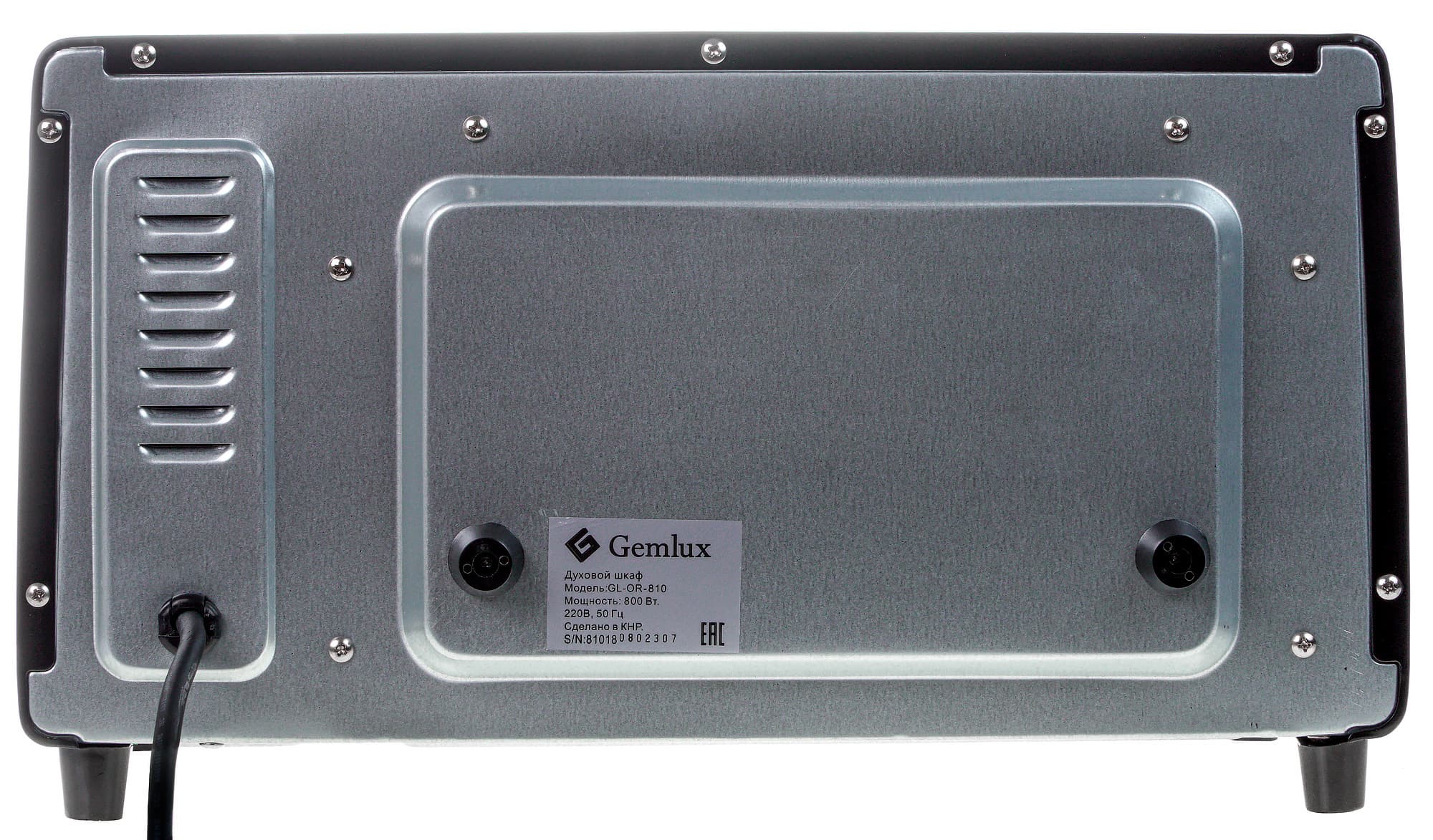 Боковые стенки духовки покрыты полукруглыми отверстиями для вентиляции, а верхняя крышка — гладкая. Задняя поверхность из некрашеной стали, с небольшим плоским выступом посередине, на котором есть пластиковые ограничители, не позволяющие придвинуть духовку вплотную к стене. Также там имеются вентиляционные отверстия и выход шнура питания. На дне духовки — четыре полых внутри пластиковых ножки, винты для разборки корпуса и отверстия для вентиляции.
