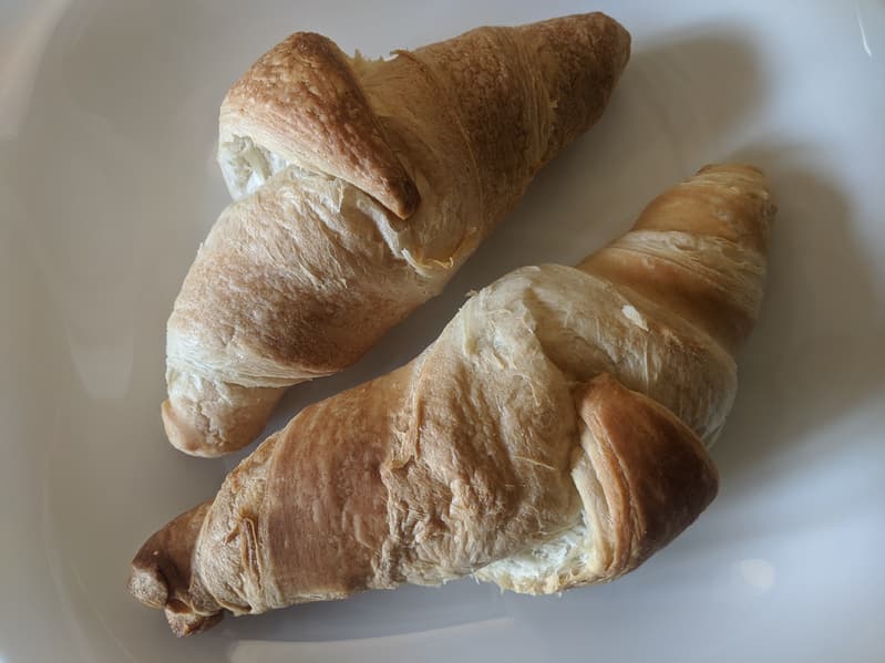 Результат оказался превосходен. Через 15 минут мы вынули из печки хорошо выпеченные, но не пересушенные круассаны, а размера поддона оказалось вполне достаточно для двух изделий.