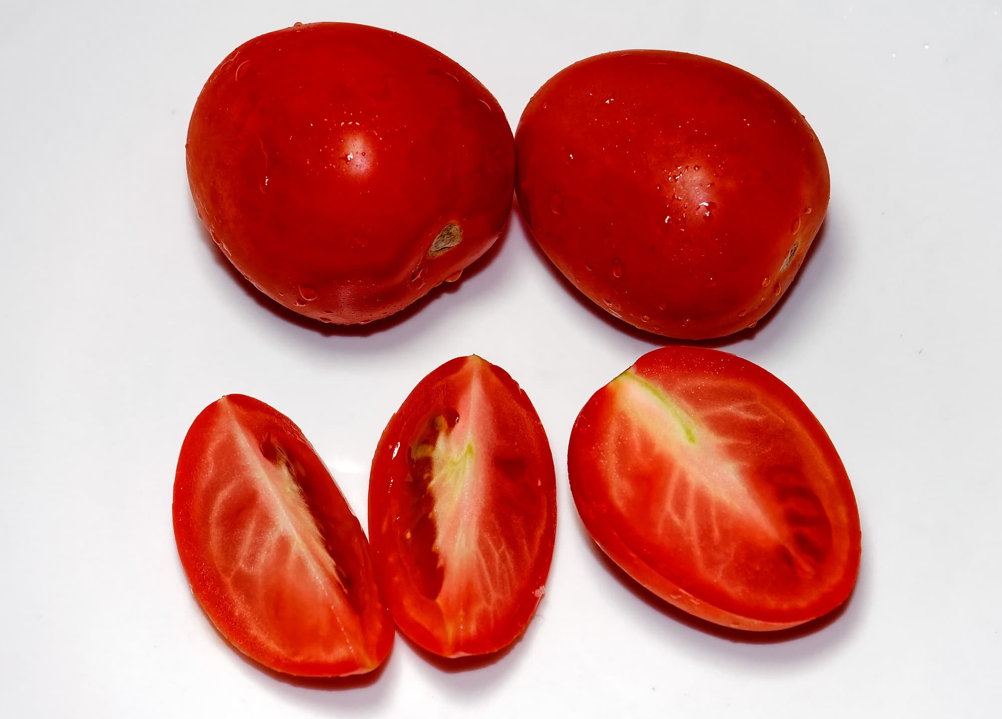 Для теста мы взяли около килограмма помидоров с достаточно жесткой и толстой шкуркой. Помидоры были разрезаны на 2-4 части, плодоножка удалена.