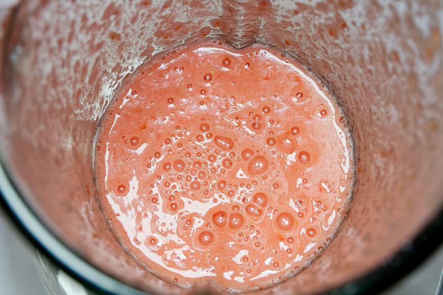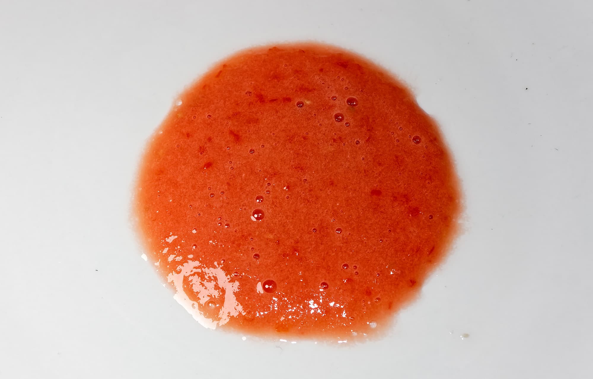 Блендирование шло в режиме blend. Визуально томаты были измельчены в первые 20 секунд. В итоге мы получили относительно однородную томатную смесь с небольшим вкраплением неперемолотых частиц кожуры.
