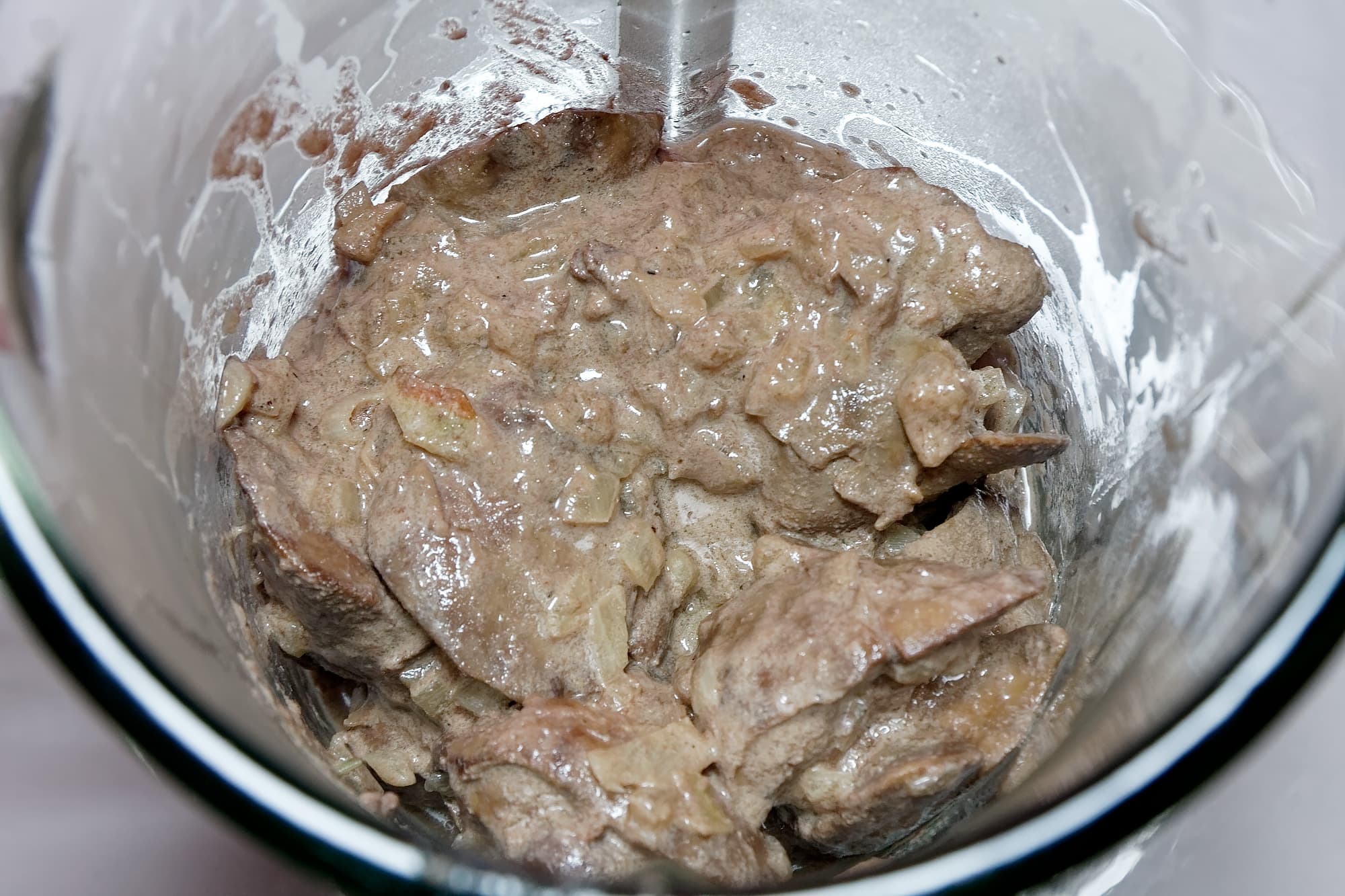 Дождались, когда содержимое сковороды остынет и поместили его в блендер. Начали измельчать на стандартной программе, периодически помешивая и включая время от времени режим «Турбо».