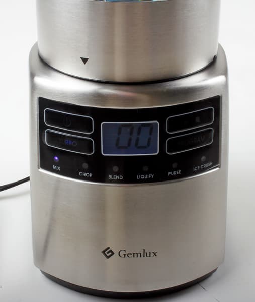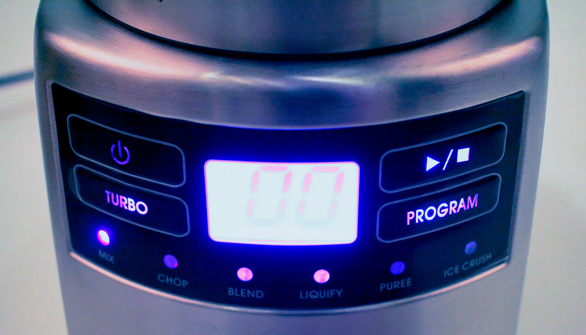 Управление блендером осуществляется с помощью панели управления, состоящей из ЖК-дисплея, четырех механических мембранных кнопок и шести светодиодных индикаторов. Все элементы в процессе работы подсвечиваются ярким синим цветом.