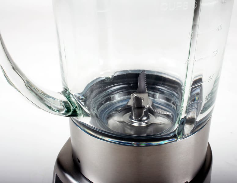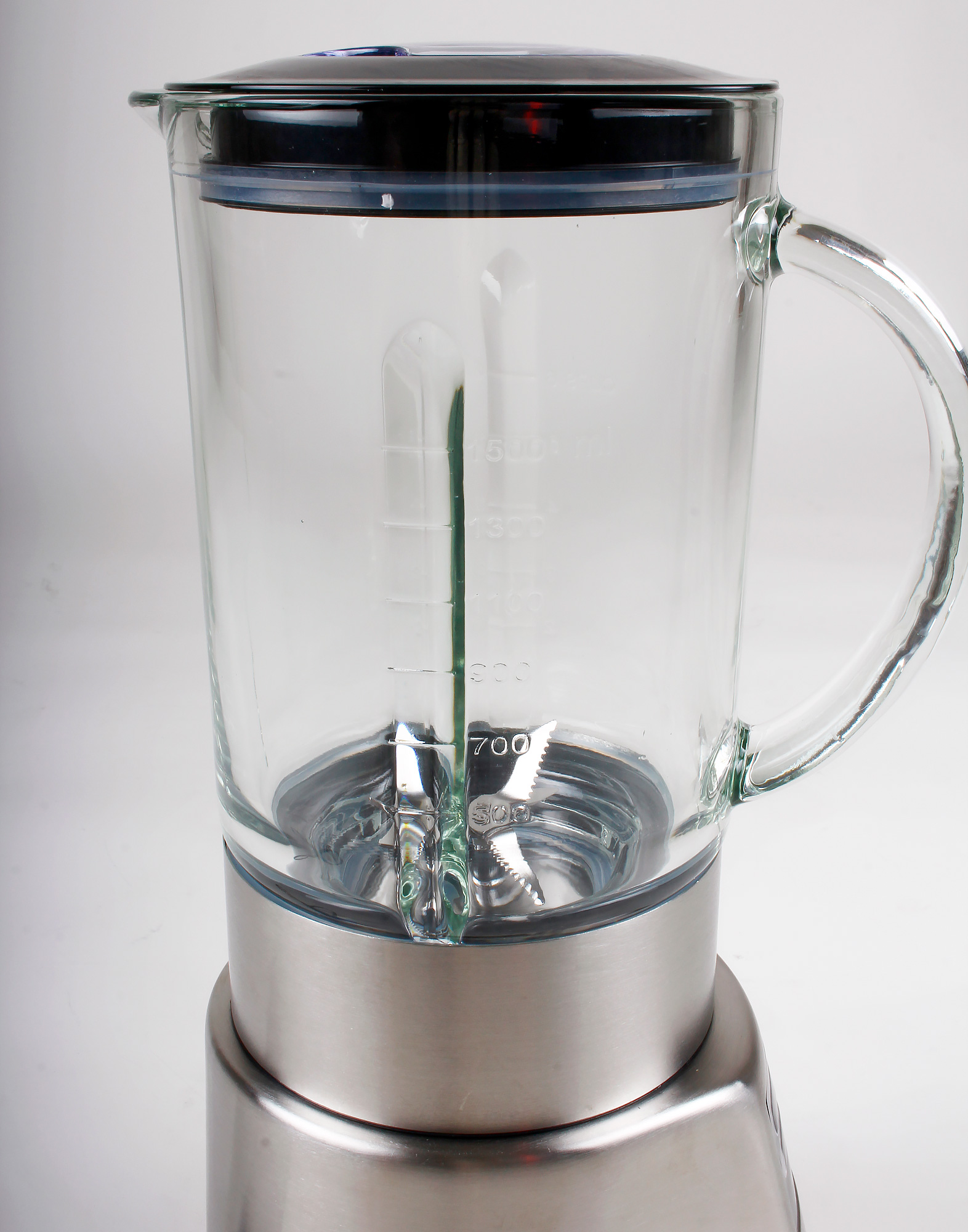 Кувшин у нашего блендера стеклянный. Рабочий объем составляет 1500 мл (фактический — заметно больше). У кувшина имеется ручка и носик, а также градуировка — от 2 до 6 чашек (с шагом в 1 чашку), от 16 до 48 унций (с шагом в 8 унций), а также от 500 до 1500 мл (с шагом в 200 мл).