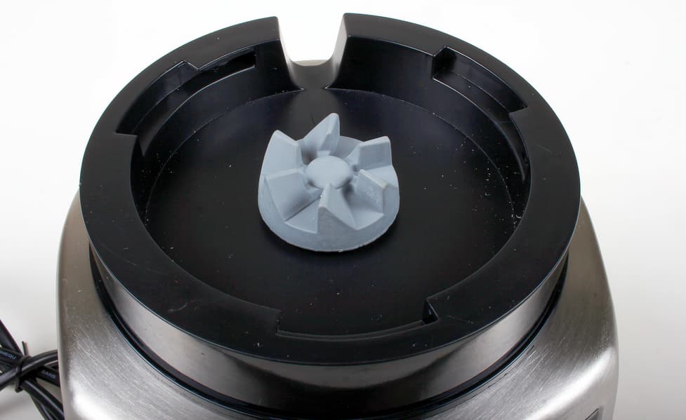 Нижняя часть кувшина, как и корпус блендера, сделана из пластика, защищенного стальным листом. Ножевой блок устанавливается снизу и фиксируется пластиковой гайкой, которую нужно будет затягивать против часовой стрелки (о чем имеется соответствующая подсказка). Для надежной фиксации гайки на ее внутренней стороне имеется шесть выступов, за которые можно ухватиться руками. Делать это не слишком удобно, однако стандартная эксплуатация не подразумевает необходимости часто снимать ножи. Защита от протечек достигается благодаря резиновой прокладке.