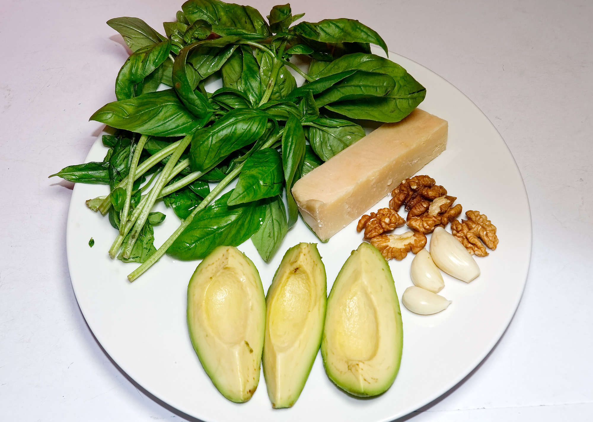 Для приготовления песто мы воспользовались проверенным рецептом. Мы взяли немного орехов, зубчиков чеснока, пучок базилика, оливковое масло, пару спелых авокадо, немного твердого сыра (который мы предварительно натерли на крупной терке), добавили соль и перец по вкусу.