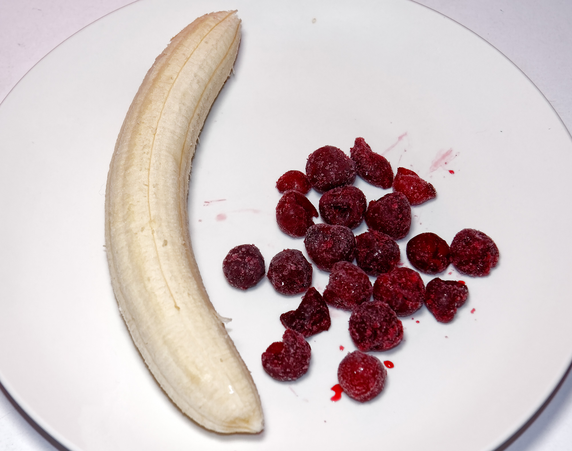 Для смузи мы взяли очищенный банан, пригоршню замороженных ягод вишни и молоко. Поместили все в чашу блендера, измельчали в режиме liquify.