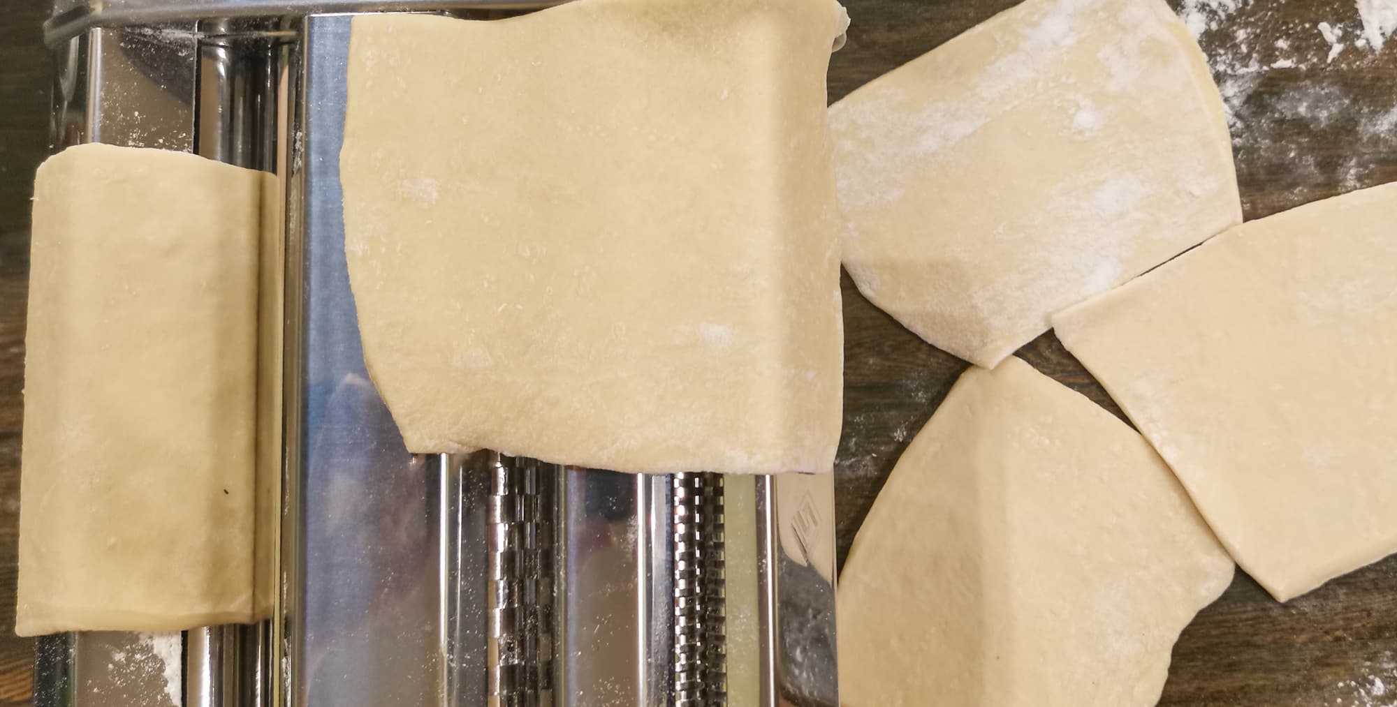 Мы приготовили не слишком тугое тесто из муки в/с мягких сортов пшеницы, яиц и воды. Нарезали на небольшие кусочки, раскатали с помощью тестораскатки, выставив на регуляторе значение 4 (толщина около 1,7 мм).