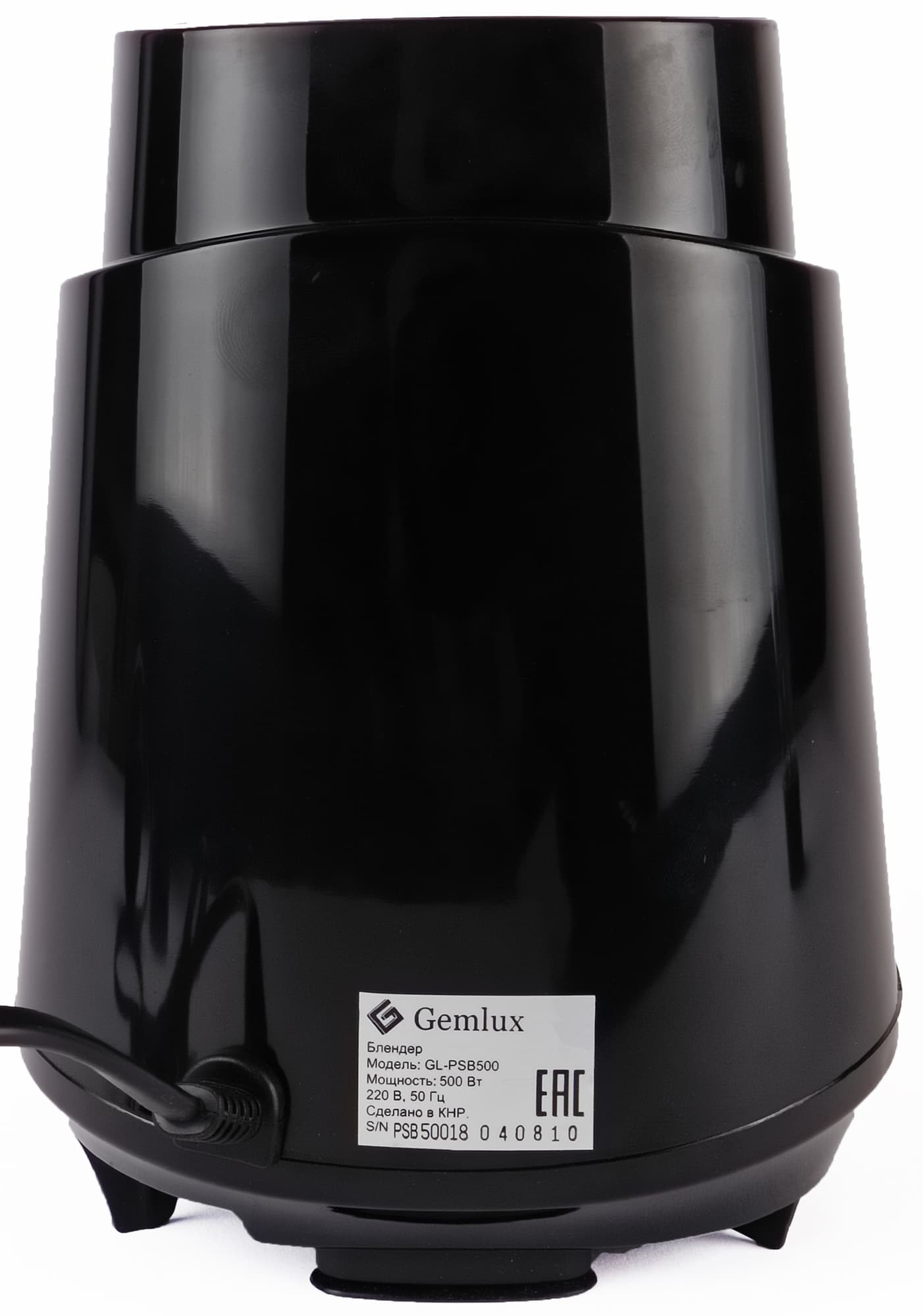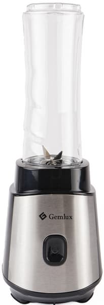 Gemlux GL-PSB500 выглядит как уменьшенная копия стационарного блендера, только ножи не закреплены на дне кувшина, а навинчиваются на резьбу, как и крышка. Моторный блок блестит черным пластиком и вставкой из нержавеющей стали на передней панели. Там же находится единственная управляющая кнопка, нажатие которой запускает работу. При подключении к сети символ включения на кнопке загорается синей подсветкой, что украшает блендер.
