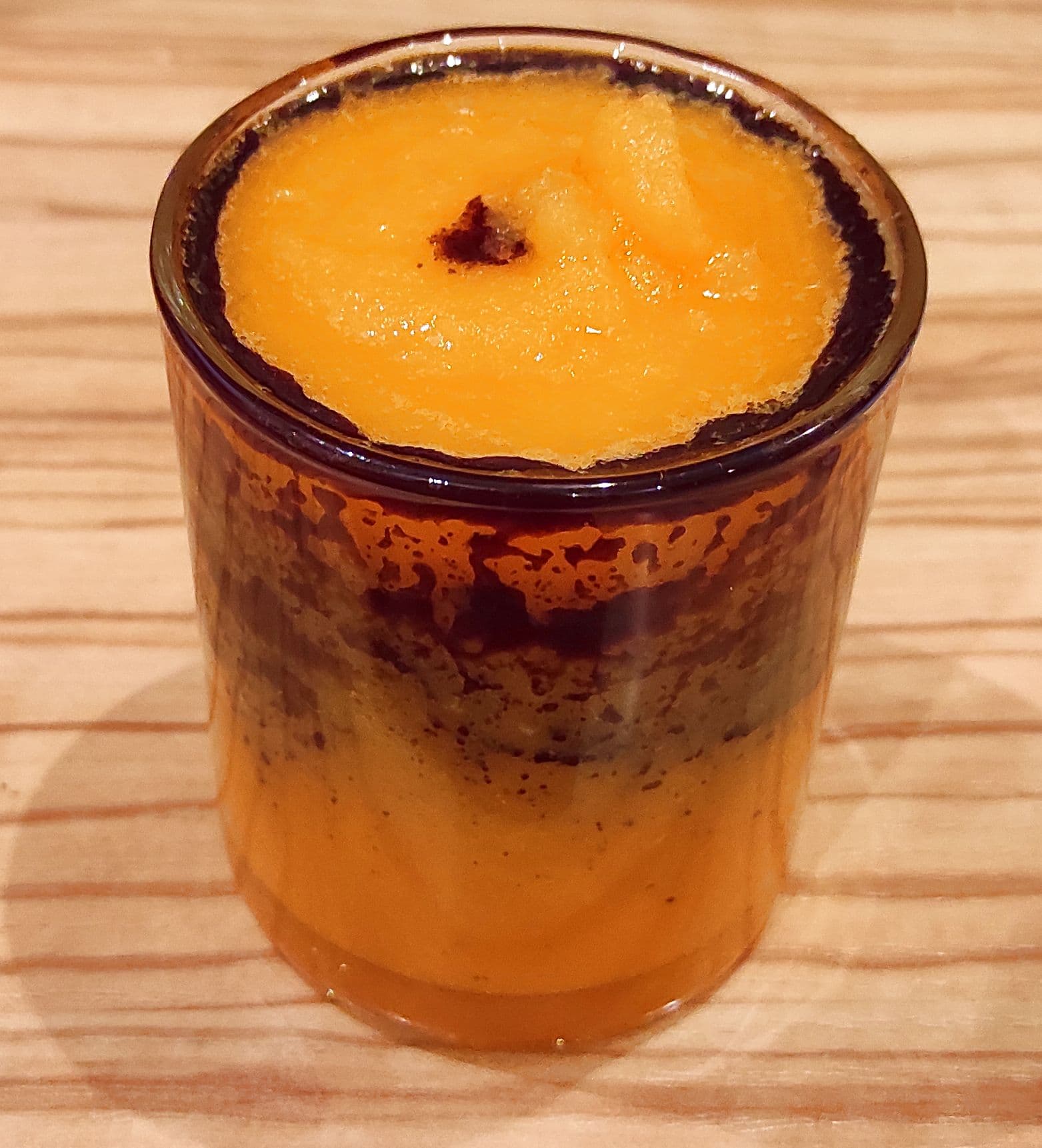 Для обработки одной порции оказалось достаточно четыре включения блендера по десять секунд, и мы получили однородную нежную текстуру, слегка зернистую. Классические смузи обычно делают менее густыми, но мы нарочно усложнили задачу. Однако и наш вариант можно было как есть ложкой, так и пить из чашки. При сервировке мы добавили немного масла тыквенных косточек, которое не только дарит пользу и прекрасный аромат, но и рисует красивые разводы на оранжевом пюре. Рекомендуем!