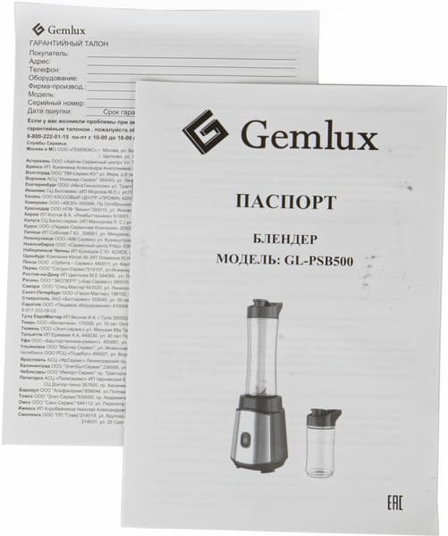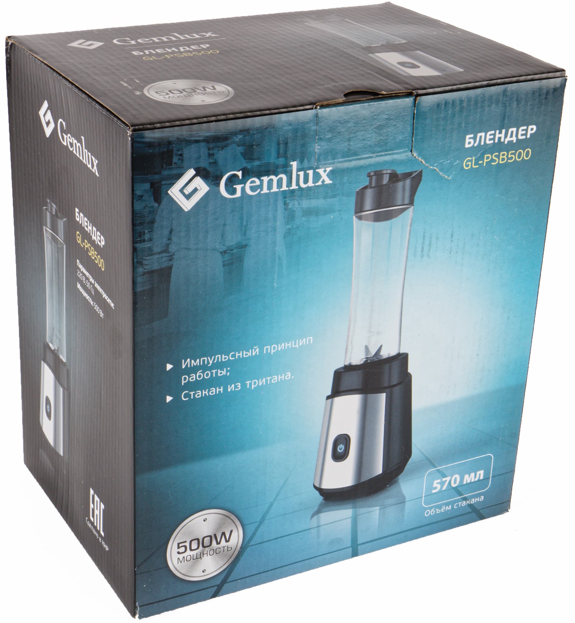 Картонная коробка в узнаваемых тонах Gemlux с градиентом от бирюзового к черному доносит до потенциального покупателя всю необходимую информацию: тип и название прибора, крупное изображение, материал и объем стакана, мощность и комплектацию дополнительным стаканом, а также двумя крышками с ручкой и отверстием для питья.