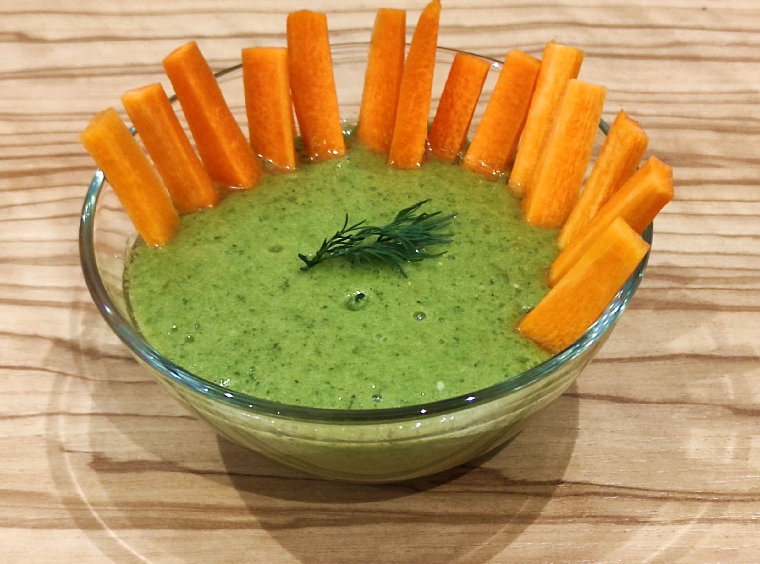Полученная текстура была такой нежной и воздушной, что напоминала мусс. Крохотные частички шкурки были видны, но не ощущались, а фрагменты косточек не были видны, но ощущались. Далее эту красоту мы отложили, а во втором стакане измельчили основу для соуса. Нарезали по две веточки укропа и петрушки, очистили четыре зубчика чеснока, добавили соль, специи, лимонный сок, 50 мл воды и оливковое масло. Полученную зеленую смесь мы соединили с помидорным пюре и получили простой соус из свежих ингредиентов, в который вкусно макать морковные палочки, начос и соленые хлебцы.