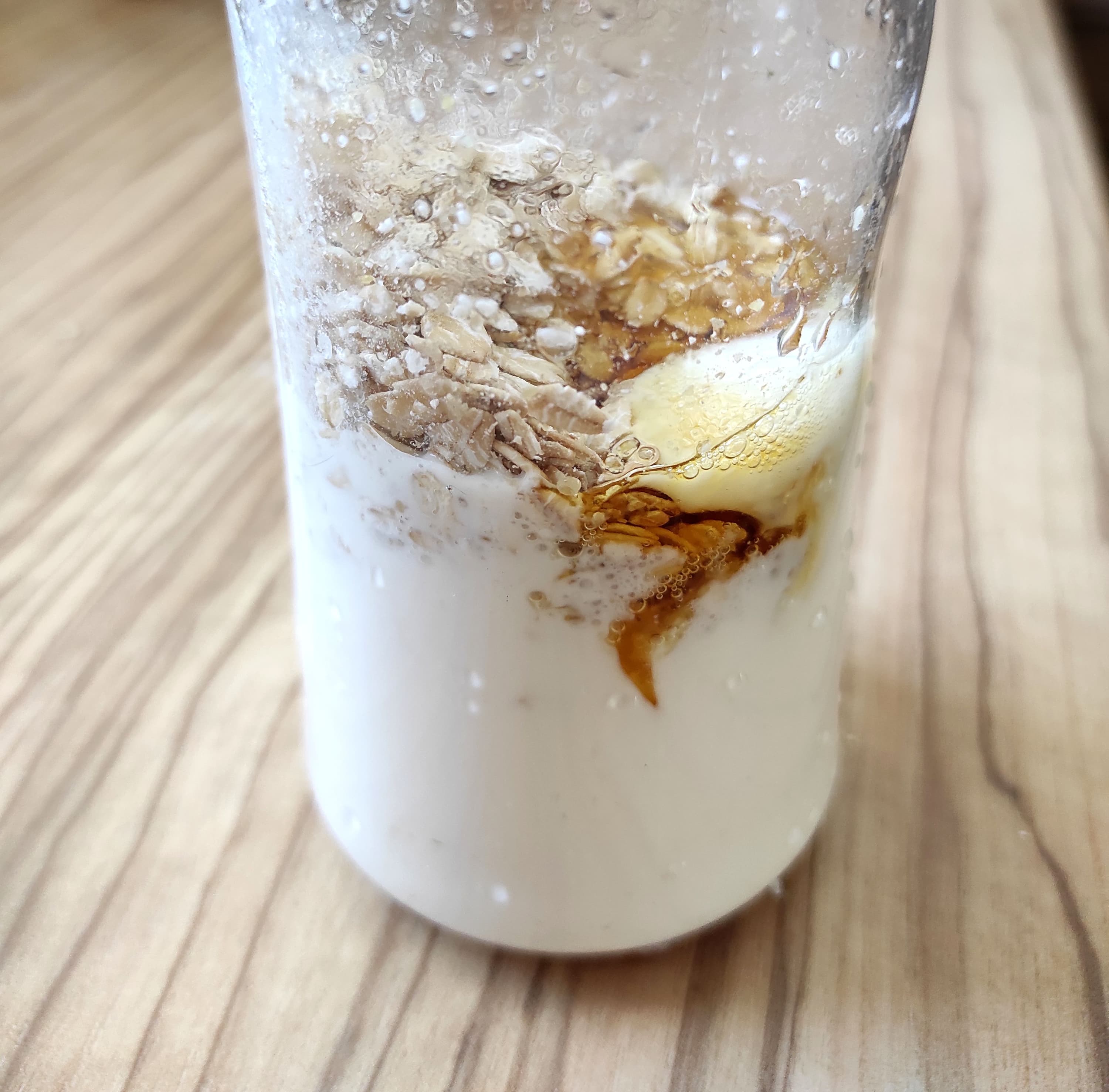 Прекрасная альтернатива варке каши — добавить в произвольных пропорциях (кисло-)молочную основу, овсяные хлопья и добавки по вкусу, подождать несколько секунд и наслаждаться завтраком. Мы выбрали ряженку пополам с водой, твердые хлопья для длительной варки и сироп топинамбура для сладости.