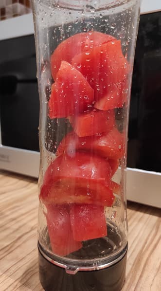 Спелые и ароматные помидоры подкупили нас, и вместо обычных мы взяли крупные азербайджанские. Один такой красавец оказался достаточно большим, чтобы занять почти весь стакан. Мы очистили томат от места крепления плодоножки и нарезали на четвертинки, затем на восьмушки. Добавили 50 мл воды и включили блендер.