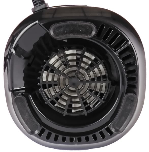 По центру дна корпуса находится белый вентилятор за черной решеткой, все из пластика. Три широкие ножки снабжены резиновыми присосками, чтобы прибор не скользил на рабочей поверхности.