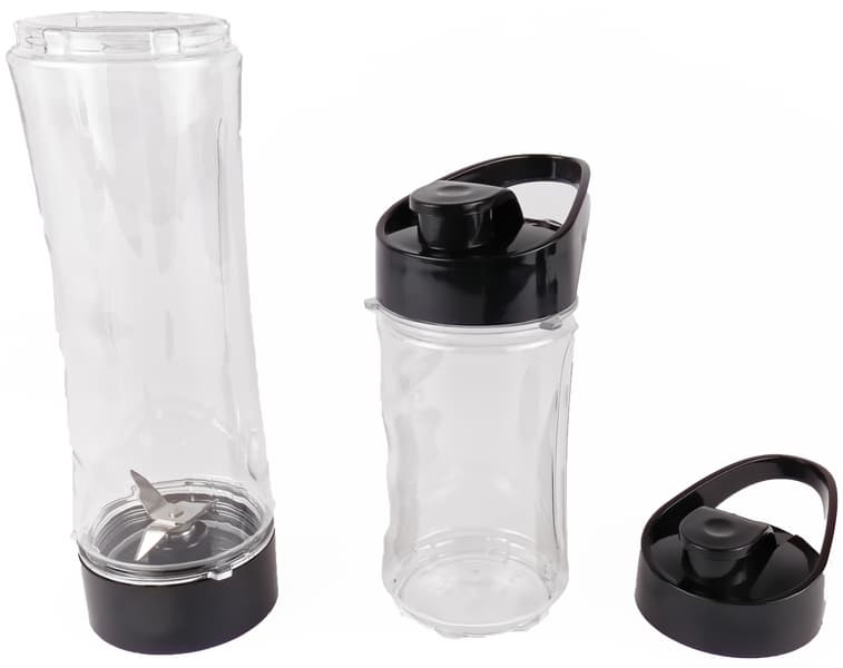 Два прозрачных стакана из тритана без «вредного ВРА» имеют объем 570 и 400 мл и полностью взаимозаменяемы. Их поверхность слегка волнистая, что и выглядит красиво, и в руке лежит удобнее — все подстроено для удобства любителей приготовить смузи и взять с собой. Рядом с резьбой на каждом стакане есть три равноудаленных выступа. Они совпадают с пазами на моторном блоке, и при сборе блендера сразу понятно, как опускать стакан. При повороте по часовой стрелке конструкция фиксируется, а по окончании работы обратное движение освобождает стакан.