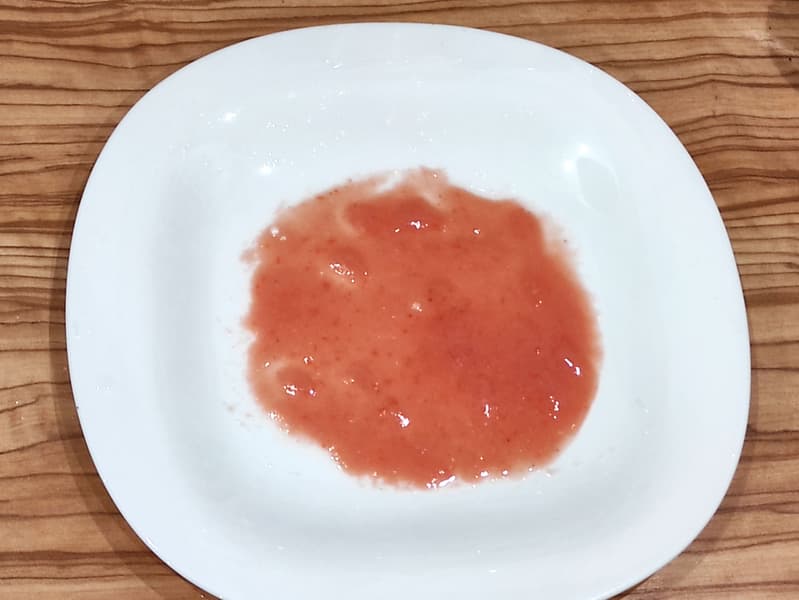 Буквально за 10 секунд помидор превратился в визуально однородную массу светло-розового цвета из-за обилия крохотных пузырьков воздуха. Мы все же продолжили процесс с паузами, чтобы суммарно измельчать содержимое в течение одной минуты.