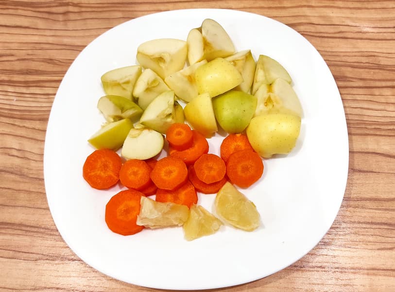 Два небольших яблока сорта «Гольден» мы очистили от сердцевин и нарезали на восьмушки, среднюю морковь нарезали кружками толщиной 0,5 см, добавили кусочек лимона без шкурки и обнаружили, что общий объем ингредиентов мы сможем обработать только в два захода. Оба раза мы добавляли по 50 мл воды, чтобы не отклоняться далеко от инструкции.