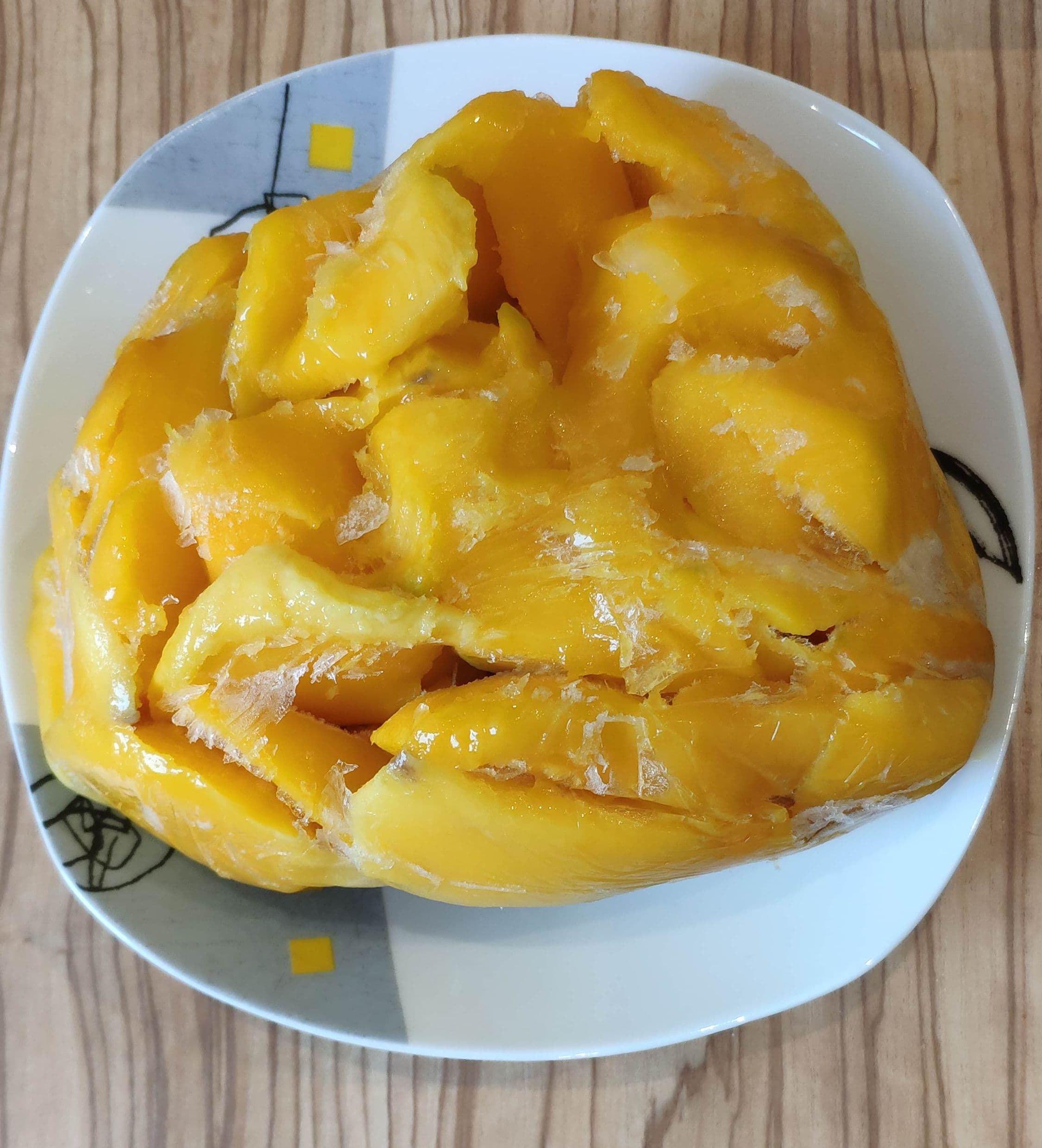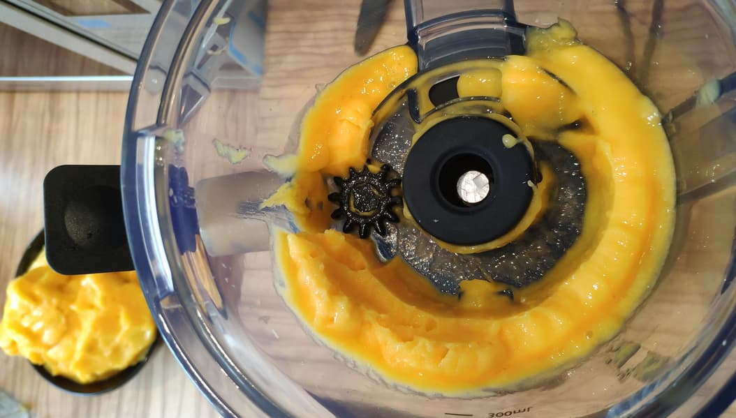 Следуя инструкции, мы оставили кусочки манго в морозилке лишь на 10 часов, а затем вытащили и дали погреться при комнатной температуре в течение 20 минут. Собрав соковыжималку с чашей для сорбета вместо фильтра, мы взялись за работу.
