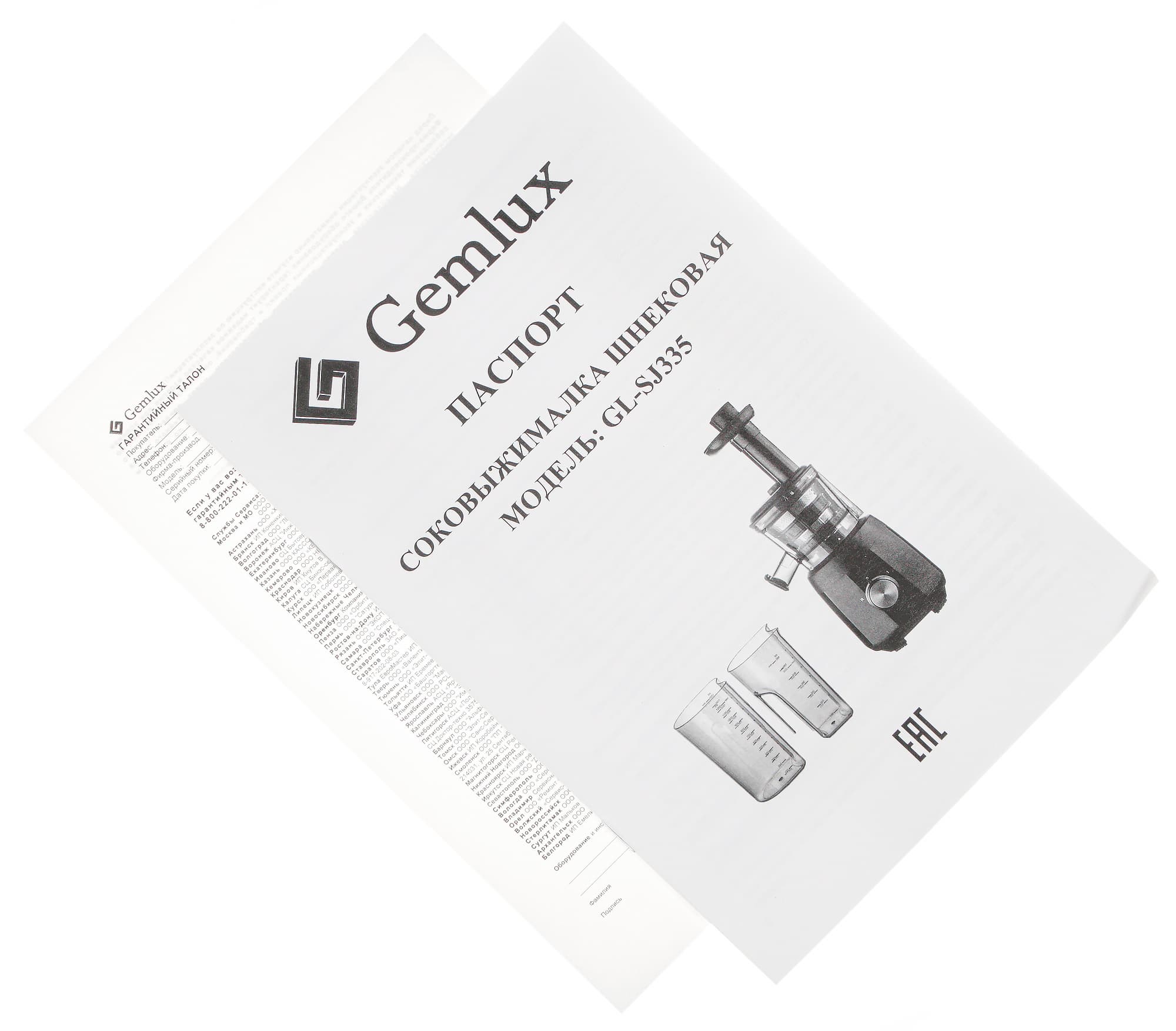Стандартная для простой кухонной техники брошюра формата А5 из полупрозрачно-тонкой бумаги содержит всего 6 страниц мелким шрифтом. Первая отдана технике безопасности, здесь все четко и отлажено повторениями из других моделей Gemlux. Вторая скупо сообщает нам технические характеристики, а именно мощность, параметры сети и скорость вращения шнека. Далее следуют разделы про конструкцию и первое использование, и вот на них напрасно сэкономили место. Схема сборки представляет собой рисунок, который в целом понятен, но ничего не говорит о порядке соединения деталей. В случае GL-SJ335 это важно, так как корпус закрепится на моторном блоке, только его его поставить первым, а затем уже вставлять держатель, фильтр и шнек. Такой информации нет в тексте — только призыв проверить силиконовую заглушку. На схеме есть цифры, но из них не следует очевидно, что порядок сборки настолько важен. Одна фраза могла бы избавить неопытных пользователей от переживаний, что с их руками или прибором что-то не так. Помимо того, два рисунка совершенно идентично изображают взаимозаменяемые чашу для сорбета и корзину фильтра, поэтому для последнего теста мы собирали прибор скорее интуитивно, чем по схеме.