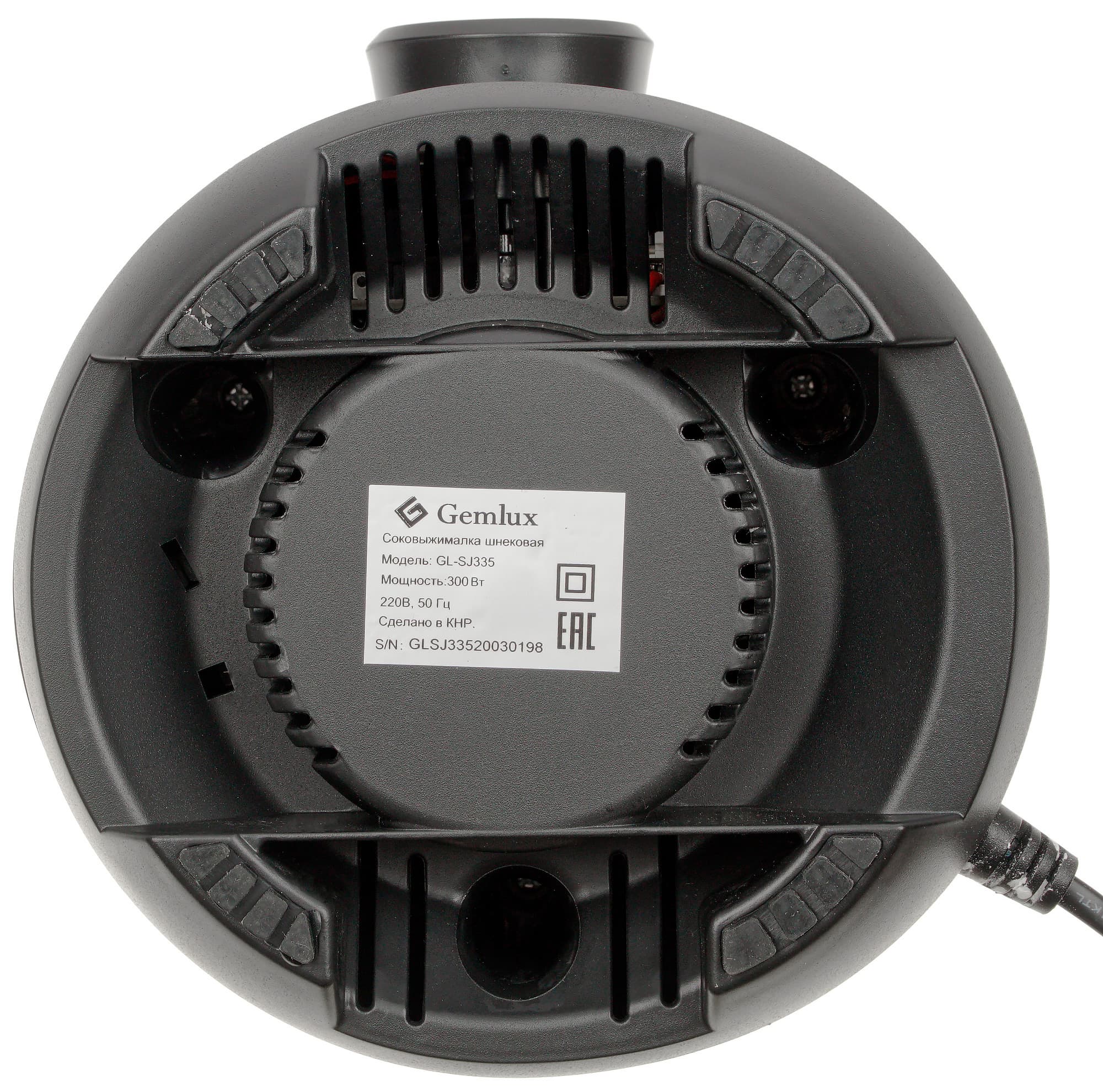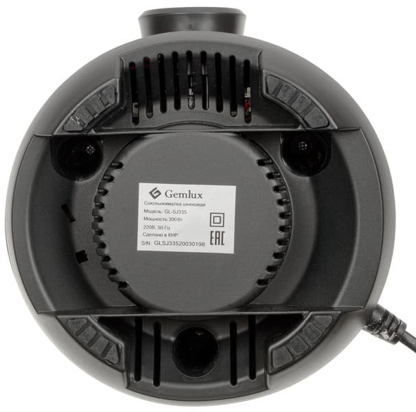 На дне мы традиционно видим четыре ножки и отверстия для вентиляции, а также наклейку от изготовителя. Отметим, что все детали соковыжималки GL-SJ335 показались нам гладкими и безопасными для касания, хотя инструкция и призывала к бдительности с фильтром и шнеком.
