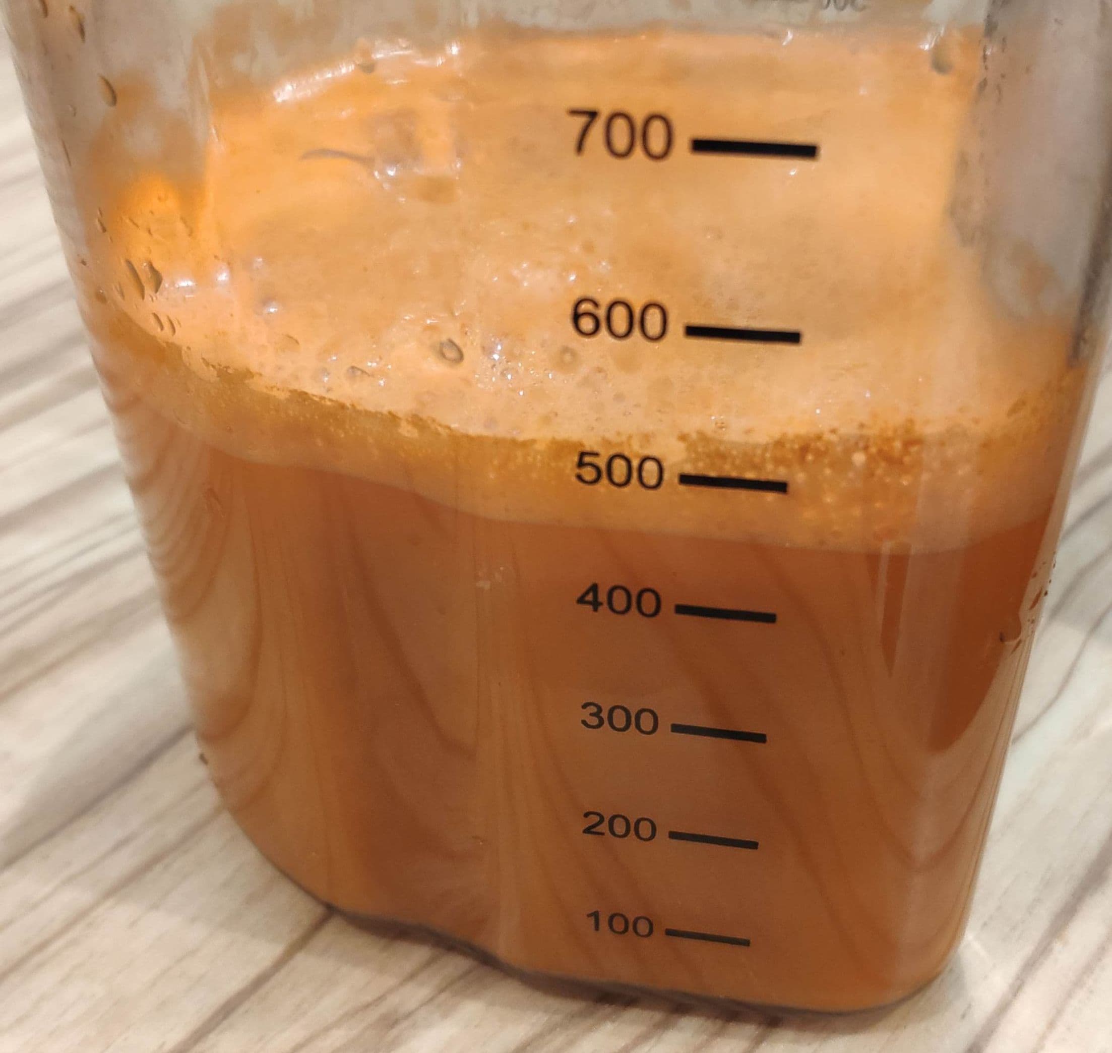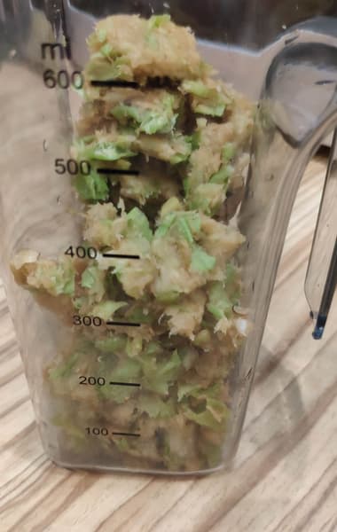 Мы очень старались, и загрузка килограмма капусты плюс активное дотекание сока заняли в общей сложности 6 минут 10 секунд. Добавив немного времени, чтобы шнек докрутил капусту внутри, мы получили прекрасный выход сока: 662 г однородной жидкости с огромной шапкой пены. Жмыха было объективно мало и он был лишь чуть влажный.