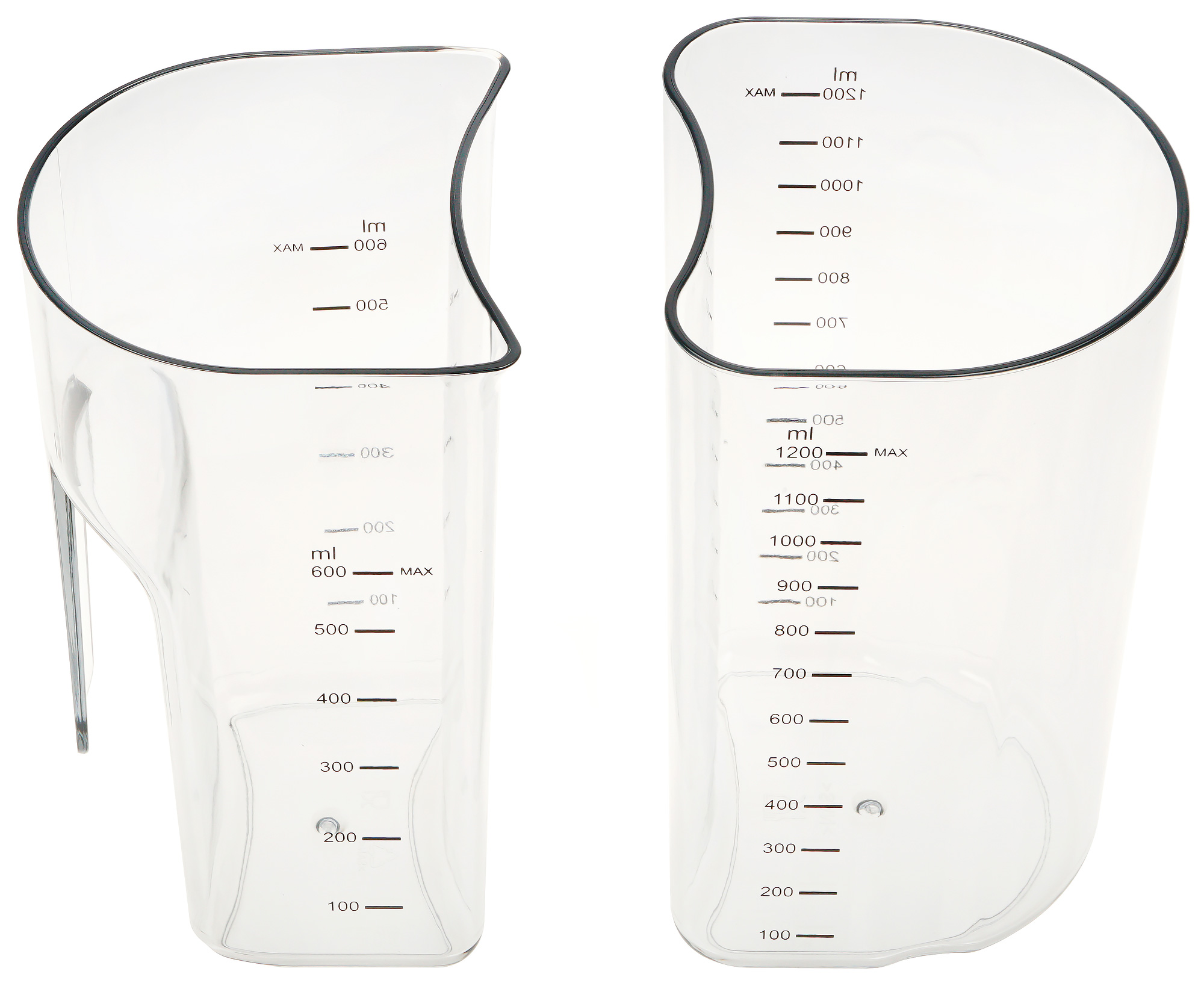 Контейнеры для сока и жмыха вкладываются друг в друга, и прибор можно разобрать и хранить так, как удобно лично покупателю. Риски на контейнерах указаны в мл для тех, кому хочется видеть эффективность отжима. У одного контейнера есть ручка, и у обоих вместо носика — скругленная поверхность, через которую, впрочем, можно аккуратно наливать сок. Изогнутая поверхность повторяет контур моторного блока, поэтому стаканы стоят максимально близко, чтобы собирать весь сок и жмых. Если судить по рискам, вместимость у контейнеров отличается в 2 раза, но фактически маленький стакан больше. Учитывая, что пропорции жмыха и сока обычно неравные, решение с разным размером логично.
