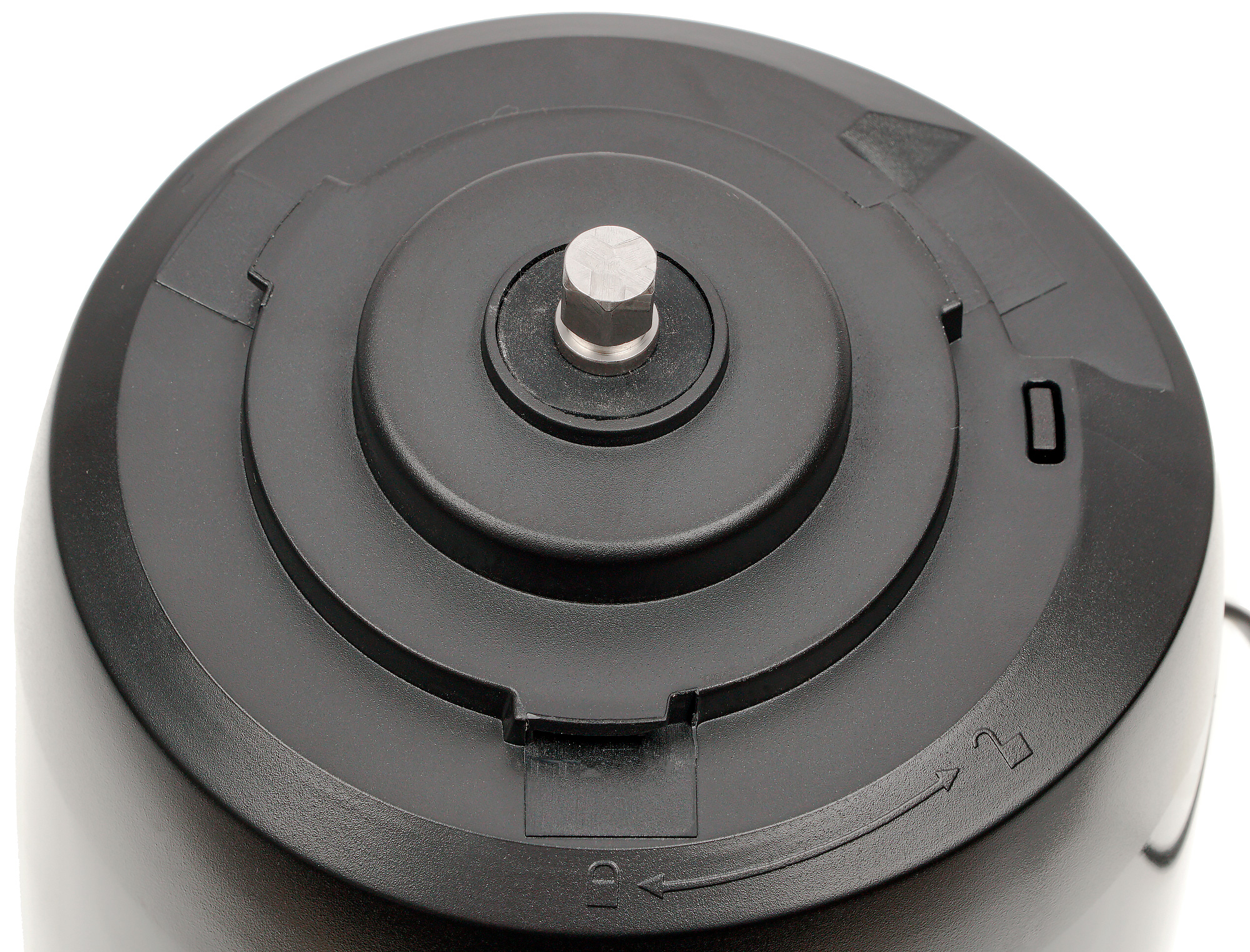 Сверху на моторном блоке мы видим круглую «ступеньку» с выступающими элементами, которые позволяют зафиксировать чашу корпуса. Невооруженным глазом заметен маленький прямоугольный рычаг, который утоплен в блок и отщелкивается, когда все собрано правильно. К нюансам сборки мы еще вернемся в данном обзоре.