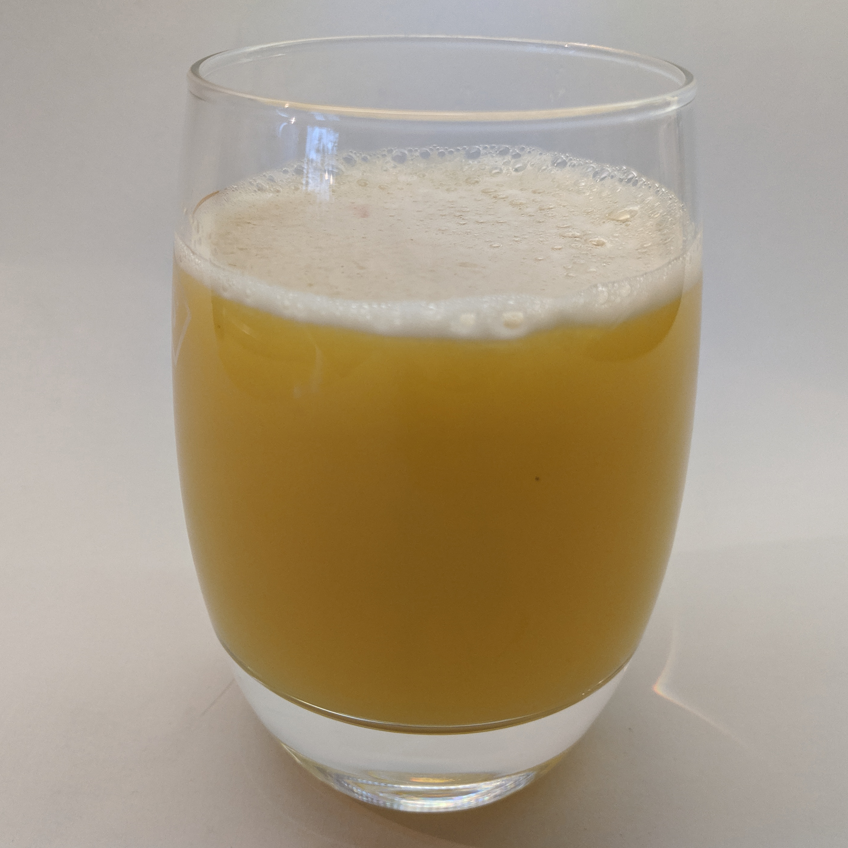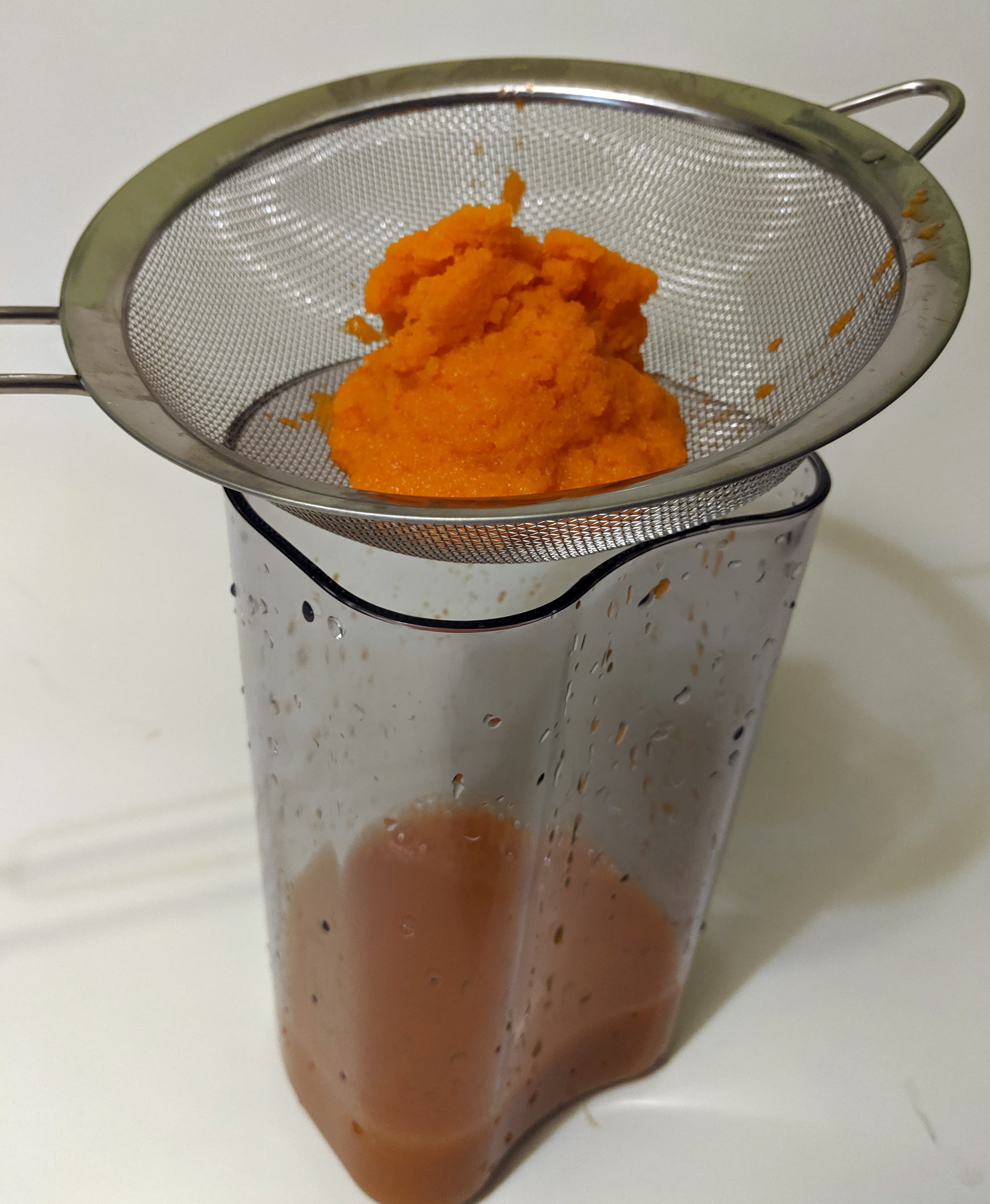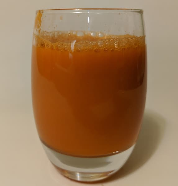Он получился яркого насыщенного цвета, но в нем оказалось много совсем уж мелкой мякоти, которую мы откинули на сито. Можно просто подождать, пока она осядет на дно емкости, или пить сок с мякотью — это полезно. Стакан сока в 200 граммов по нашим измерениям содержит 173 грамма чистого сока и 16-17 граммов практически сухого жмыха.