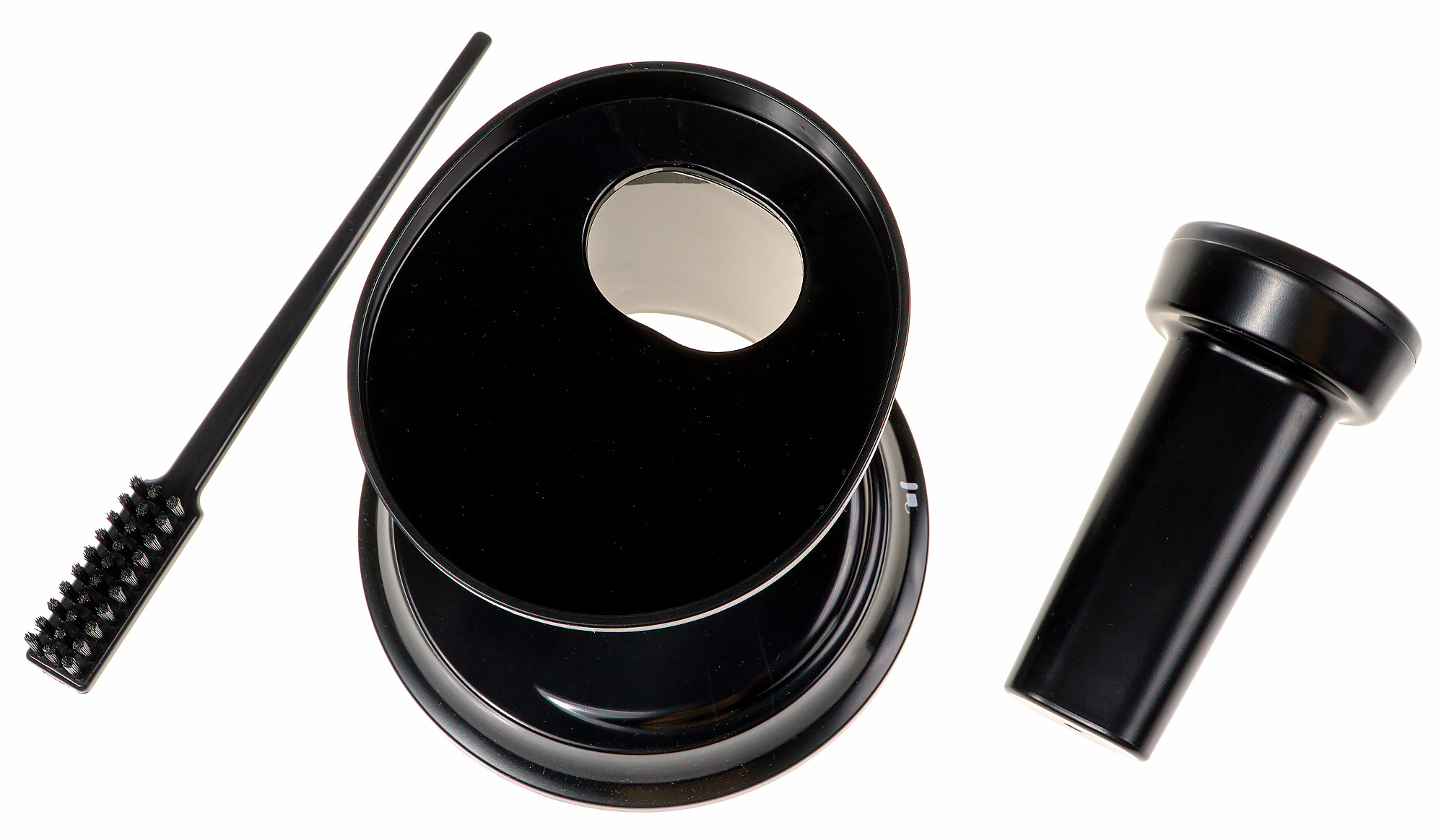 Толкатель из такого же матового пластика, что и крышка, представляет собой цилиндр диаметром чуть меньше размера отверстия с удобным расширением-ручкой.