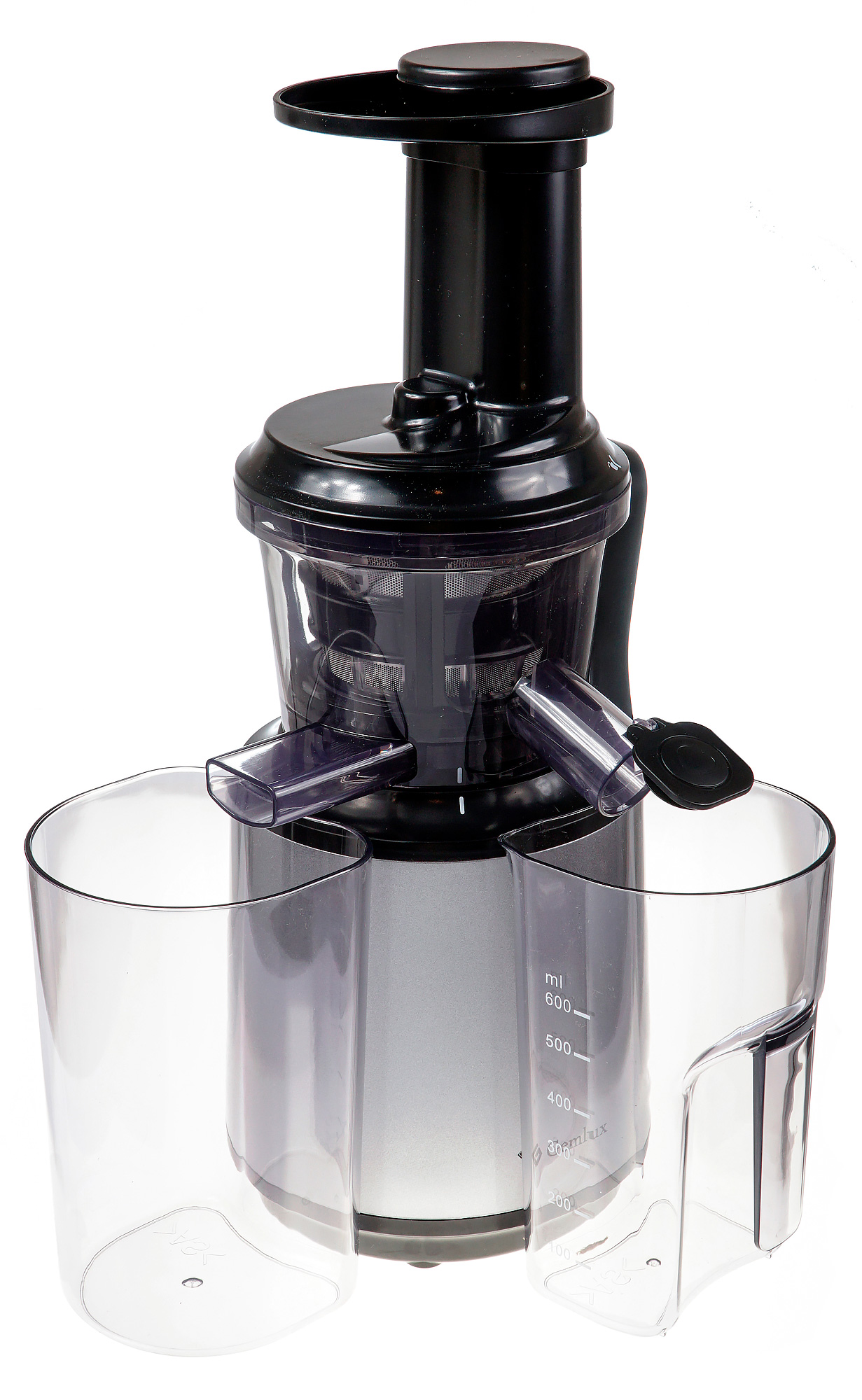 На выпуклой стороне стакана есть удобная ручка, за которую его можно извлекать из-под носика и быстро сливать сок. На бок стакана нанесена шкала объема, которая показывает, сколько сока уже выжато.
