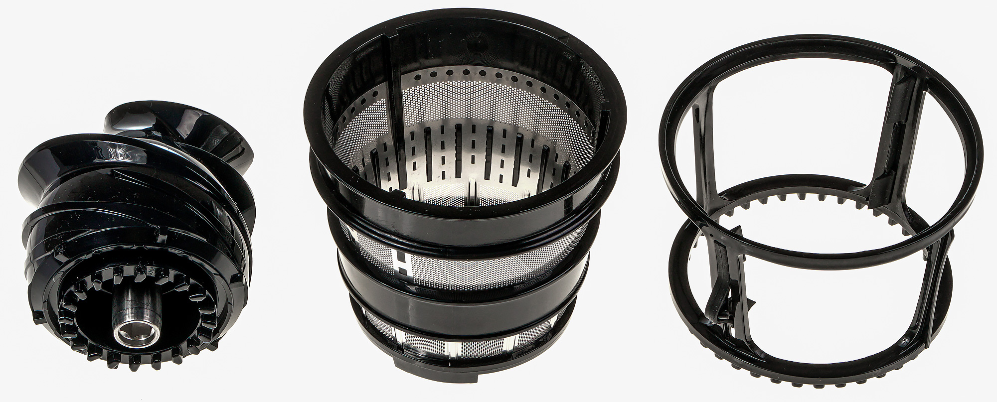 Фильтр в этой соковыжималке один, он представляет собой стальной перфорированный перевернутый усеченный конус, который опирается на держатель из черного пластика. Сверху у фильтра более крупные отверстия, снизу — более мелкие. Фильтр вставляется в чашу, уже закрепленную на моторном блоке. Для облегчения его позиционирования служат две риски — на самом фильтре и на выступе моторного блока.