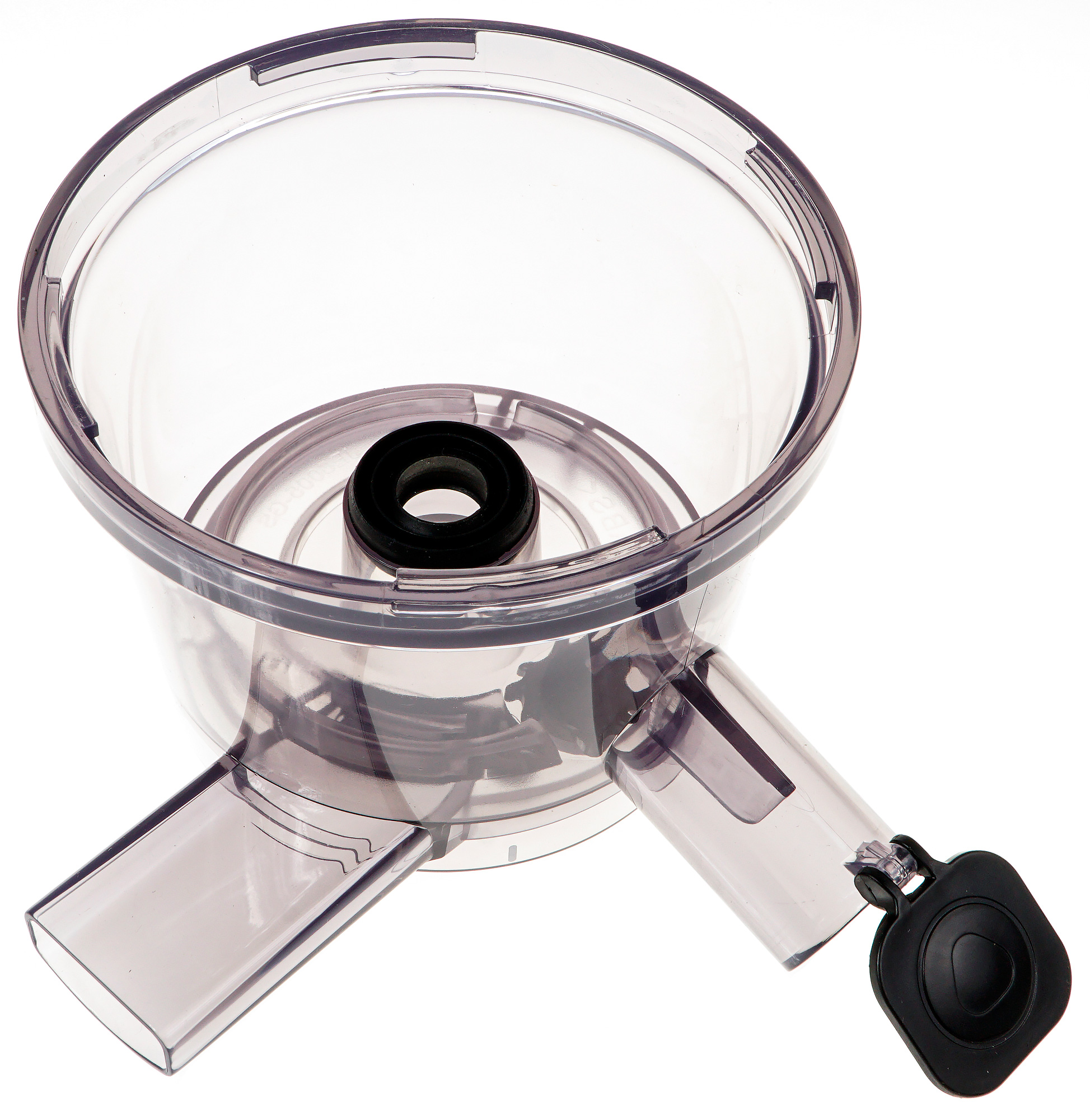 Из чаши под углом около 90 градусов выходят два патрубка, которые называются носиками: один из них для мякоти, другой для сока. Перепутать их невозможно: тот, который для сока, мало того, что в сечении круглый, так еще и закрывается на выходе прорезиненной крышечкой. Это очень удобно: можно опорожнять стакан для сока в процессе работы и не проливать сок на стол. Главное — не забыть открыть его в начале работы.