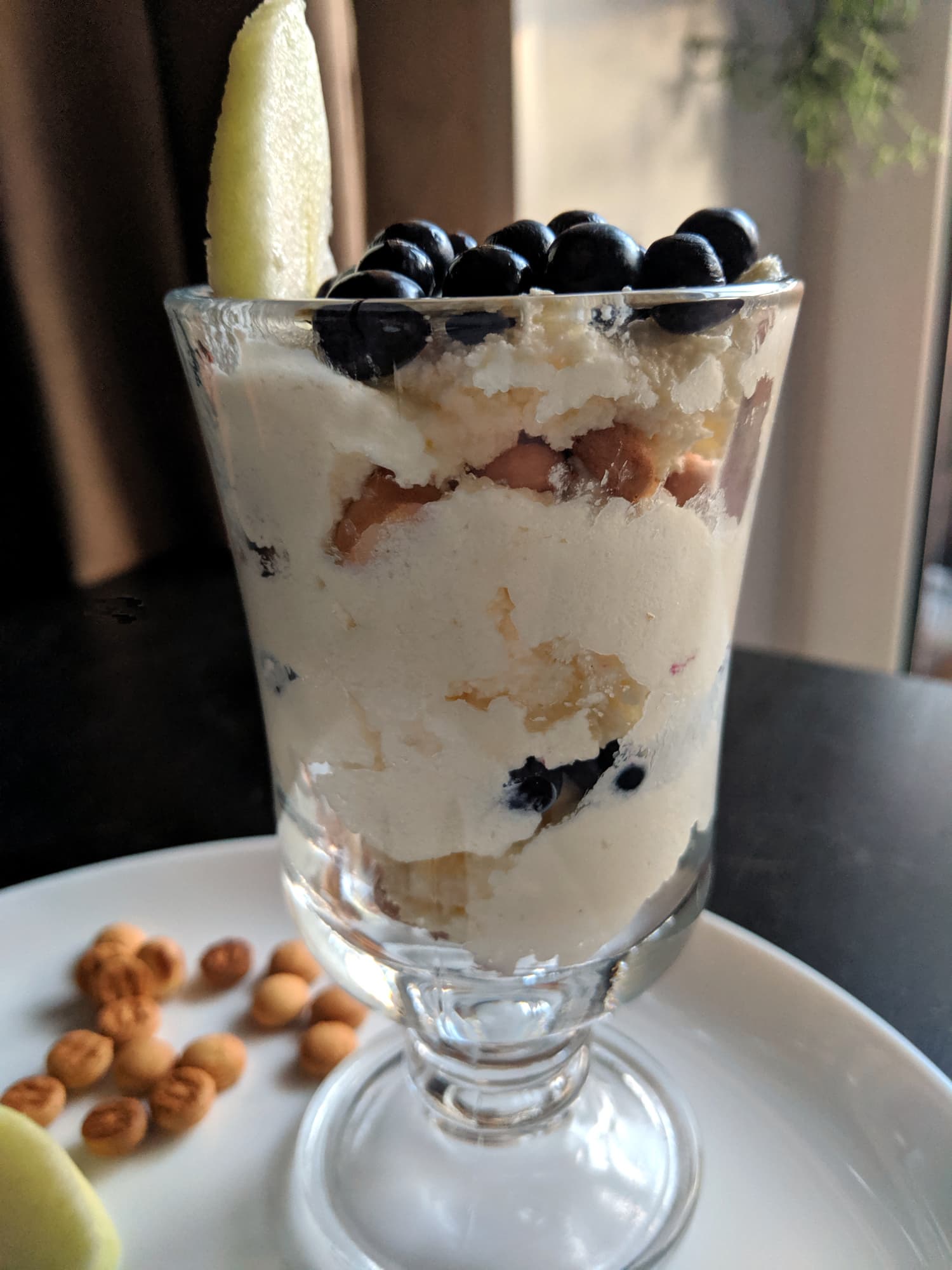 Можно заморозить крем в морозилке и несколько раз перемешать в процессе — тогда получится что-то вроде мороженого. Можно прослоить или украсить сверху бисквитный торт. Но мы просто взяли мелкое печенье, крем и свежую чернику и собрали простой слоеный десерт, который отлично подойдет к несладкому кофе.