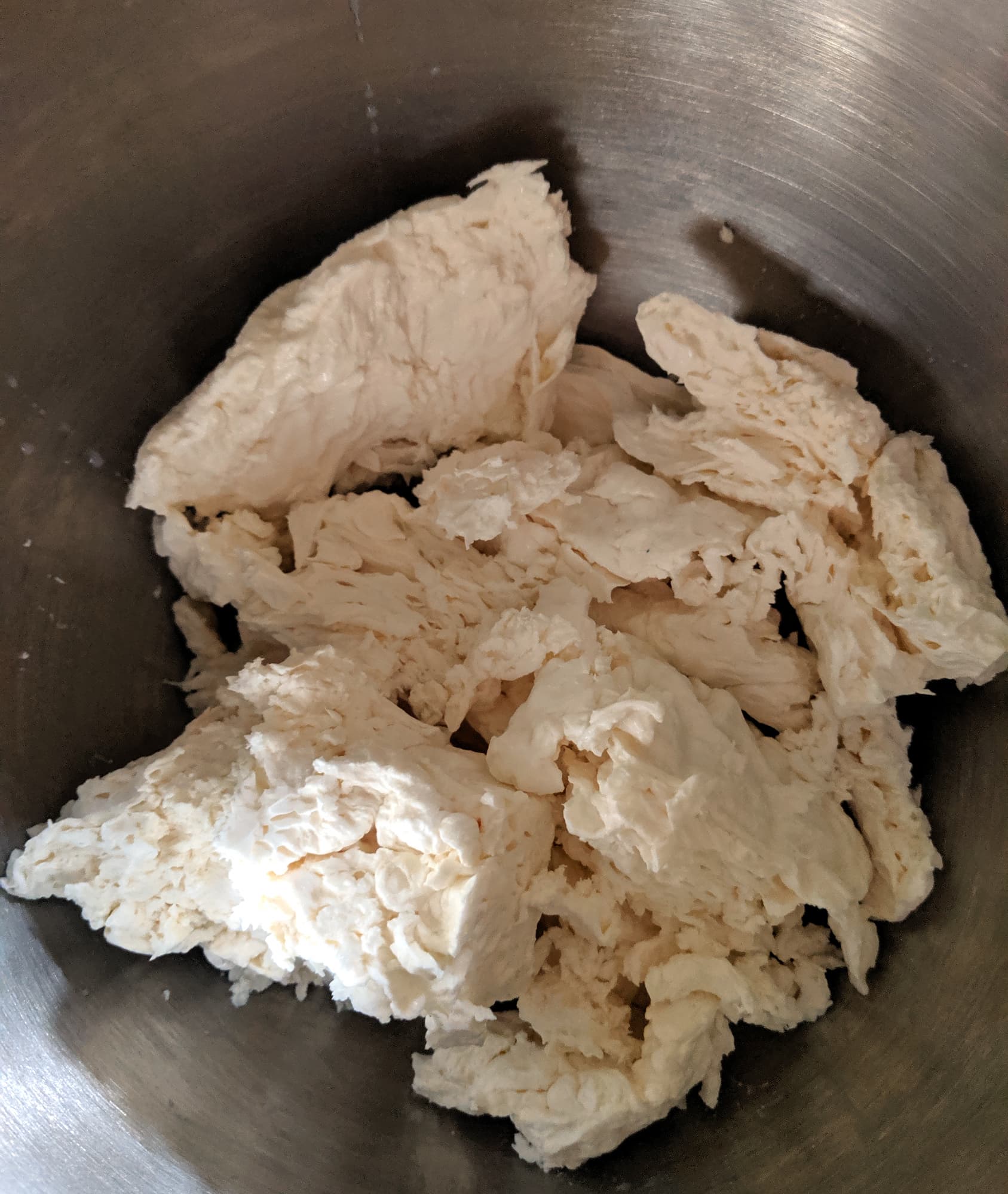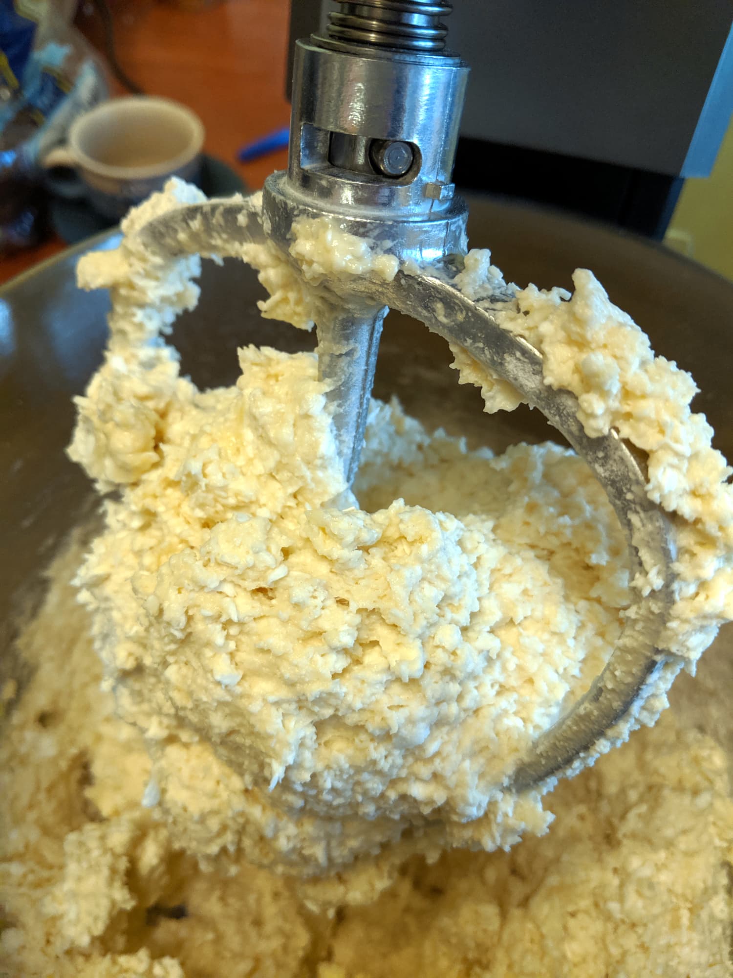 Сначала плотный творог превратился в относительно однородную (без крупных кусков) массу. После добавления яиц тесто стало более гладким и на вид достаточно легким, так что мы добавили муки, не меняя насадку. Некоторое время вымешивание теста шло успешно, но затем, после очередной порции муки, начало налипать на мешалку так, что она уже не мешала, а только крутила на себе ком теста.