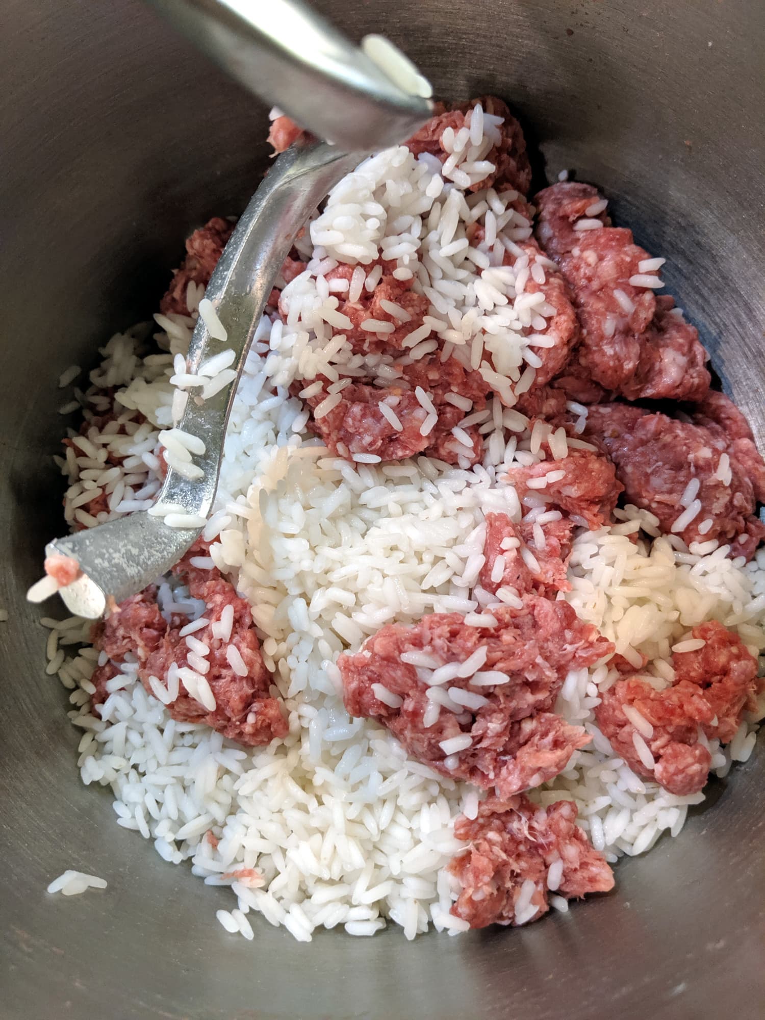 После того, как соль и специи были смешаны с фаршем, мы добавили в миску около 400 граммов риса, сваренного до полуготовности. Еще три минуты на второй скорости — и начинка готова. Рис сохранил свою целостность, равномерно распределился по начинке, которая стала достаточно плотной, чтобы не рассыпаться в перцах, но и достаточно мягкой, чтобы равномерно в них протушиться.