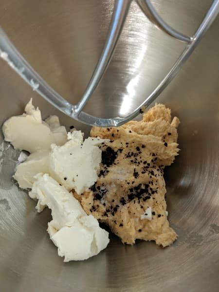 Мы положили в чашу планетарного 900 граммов готового куриного паштета-полуфабриката: только курица, вареная морковь и немного бульона. В качестве дополнения использовали 250 граммов сливочного сыра, соль и немного черного копченого перца. Насадка — битер, скорость — третья, время, затраченное на вымешивание — 3 минуты 15 секунд.