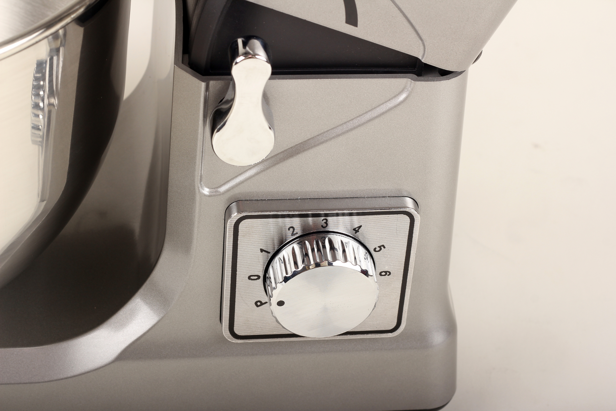 Управление скоростями осуществляется с помощью круглой рукояти на правом боку планетарного миксера. Поворотом «от себя» скорости переключаются от нуля до шестой с небольшими щелчками, фиксирующими скорость. Поворот от нуля «на себя» включает турбо-режим.