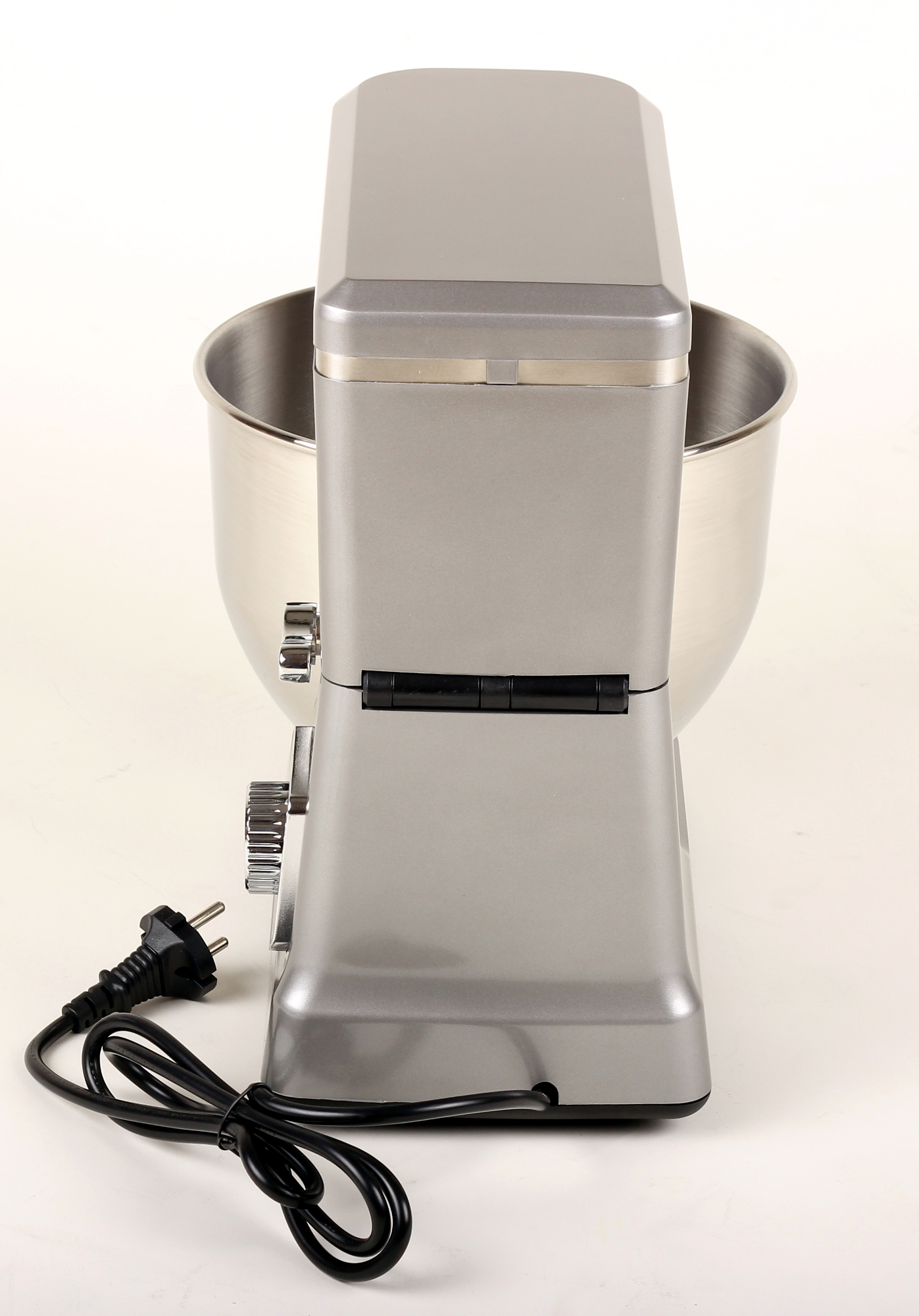 Самый крупный элемент в дизайне этой модели — пятилитровая чаша, которая занимает практически все пространство между платформой и плечом. Чаша сделана из нержавеющей стали и крепится на подставке поворотом против часовой стрелки. Впервые такое видим, непривычное ощущение: каждый раз надо подумать, куда повернуть. Поверхности чаши — и внутренняя, и внешняя — гладкие, блестящие. Дно немного вогнуто внутрь для лучшего взбивания. Чаша достаточно легкая и удобная в обращении.
