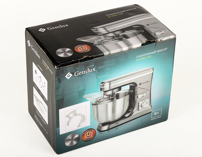 Коробку мы легко опознали не только по названию и логотипу компании Gemlux, но и по сочетанию бирюзового и черного цветов, а также по одинаковым изображениям планетарного миксера GL-SM5.1GR на широких ее сторонах и по медалям, на которых указаны самые важные качества прибора: мощность 1000 Вт и 6 скоростей. Отдельно, но не на медали, указан также объем чаши: 5 литров.