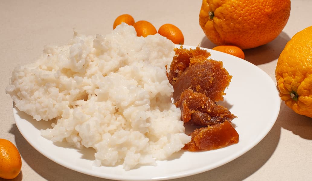 Необычно, но за счет сочетания тянущегося, нежного риса со сладковатым вкусом и резкого цитрусового мармелада — довольно вкусно.