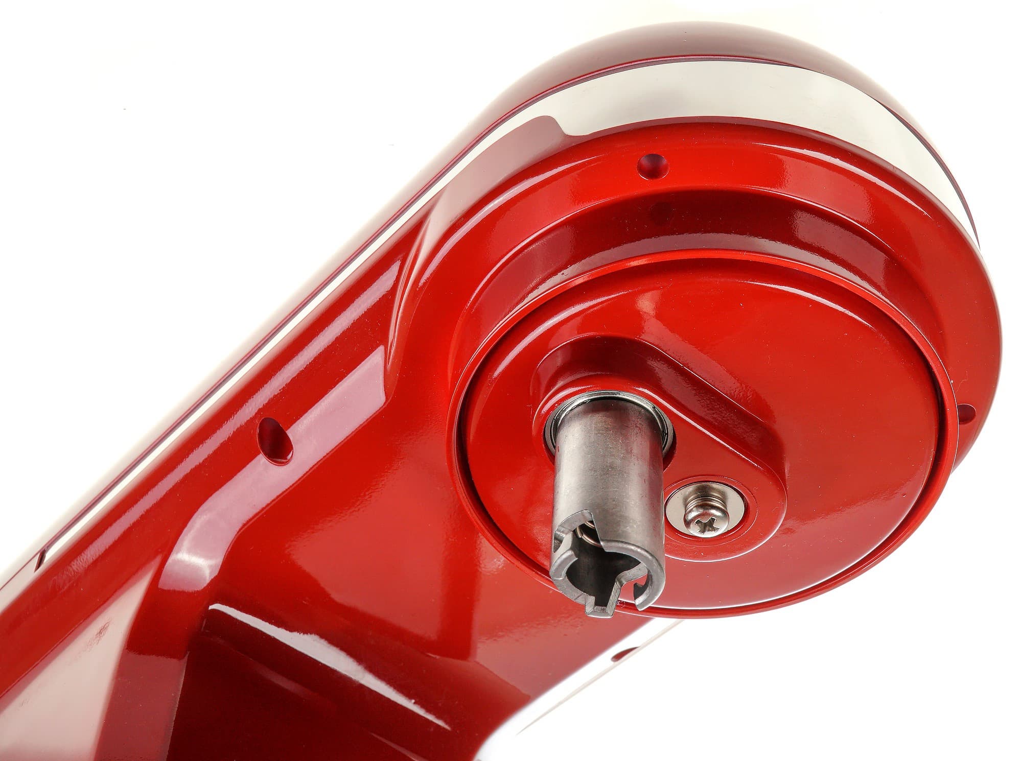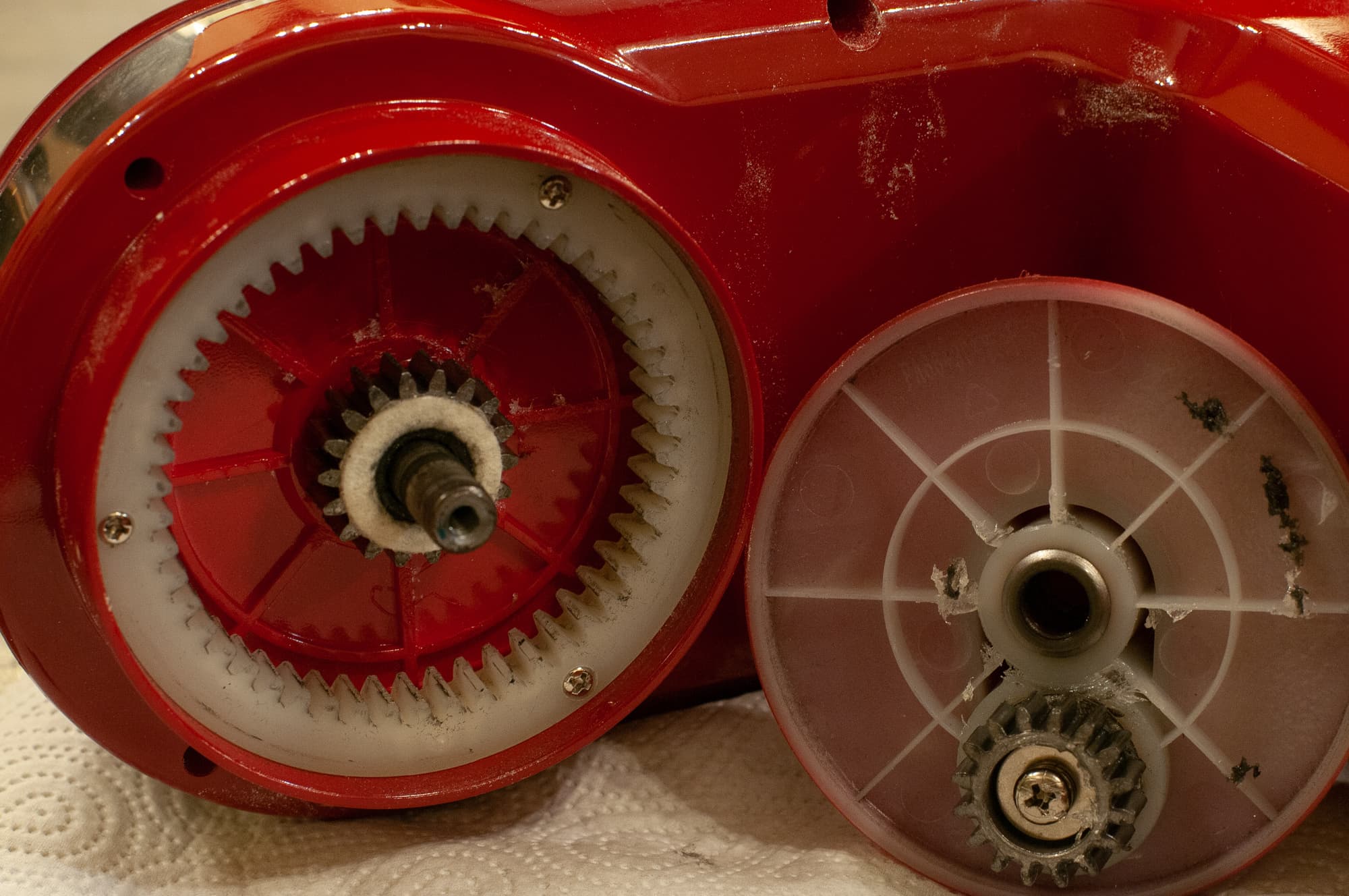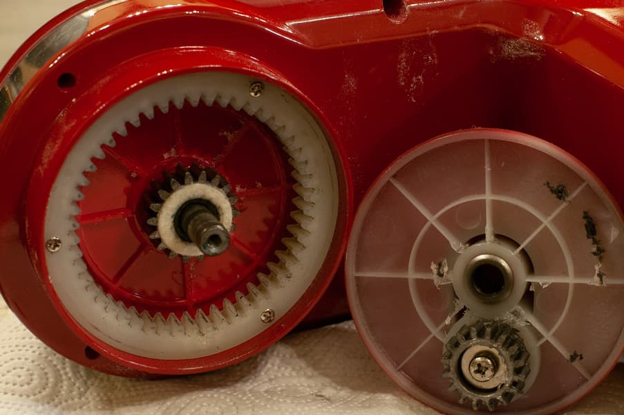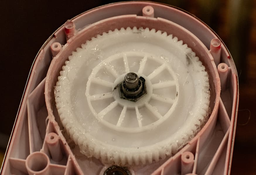 Открутив винт с гроверной шайбой снизу головки миксера, мы видим две шестерни — металлическую, крутящую насадки и полиамидную, обеспечивающую вращение насадки по кругу. Шестерни надежны, консистентная смазка присутствует.
