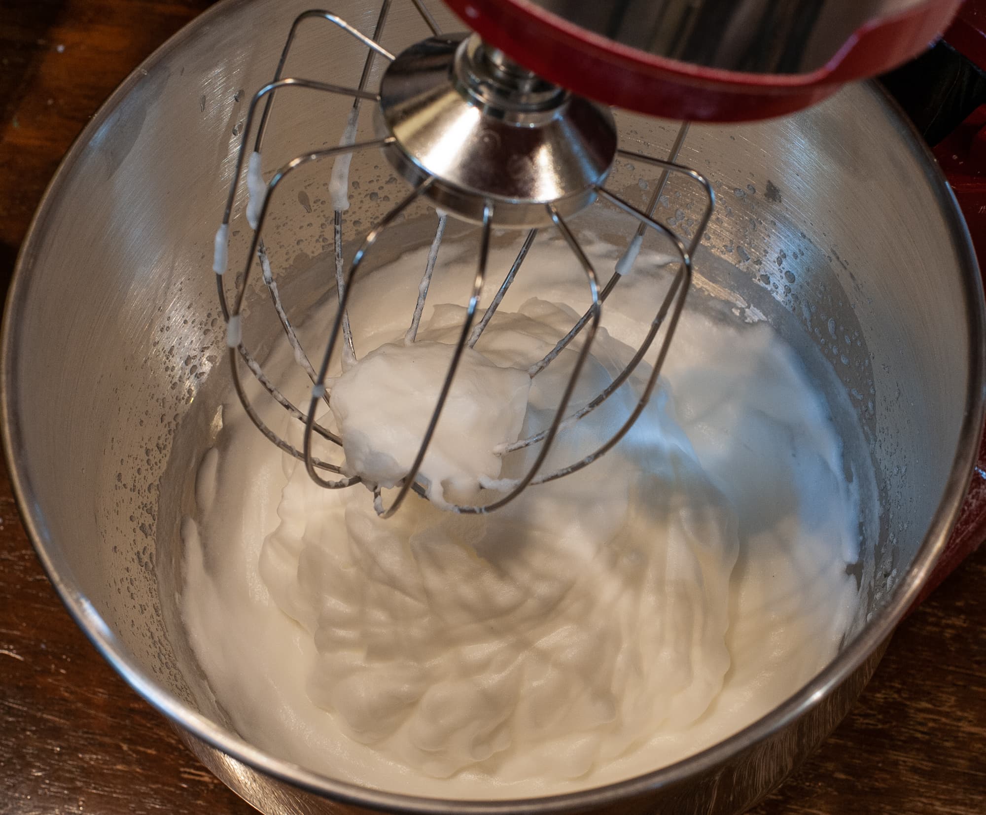 Отделенные от желтков белки с солью мы взбили миксером на максимальной скорости до образования густой пены.