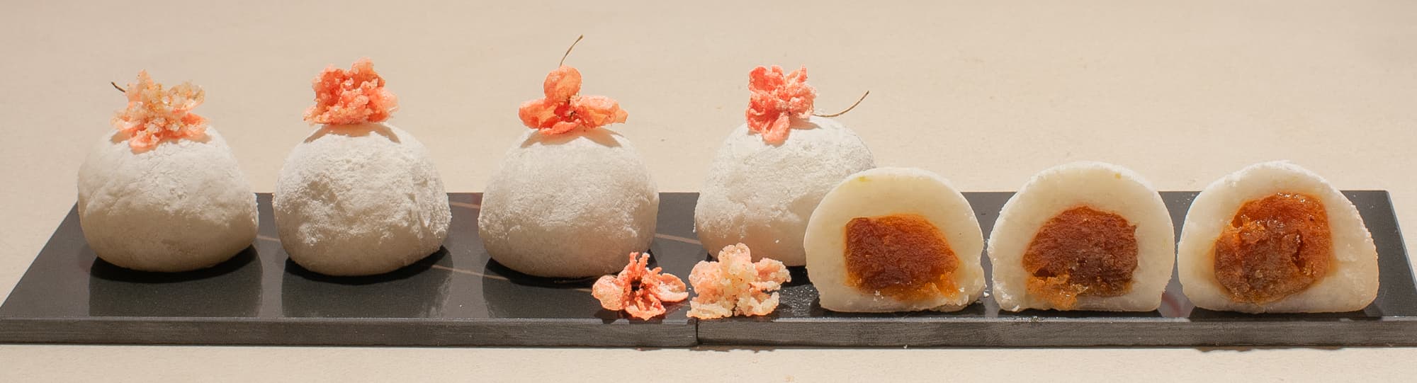 Процесс вымешивания занял пять циклов по 10 минут с небольшими перерывами, после них мы посчитали массу достаточно однородной и сформировали из нее шарики с начинкой из цитрусового мармелада. Обваляли их в крахмале с сахарной пудрой, украсили засахаренной сакурой и подали на стол.